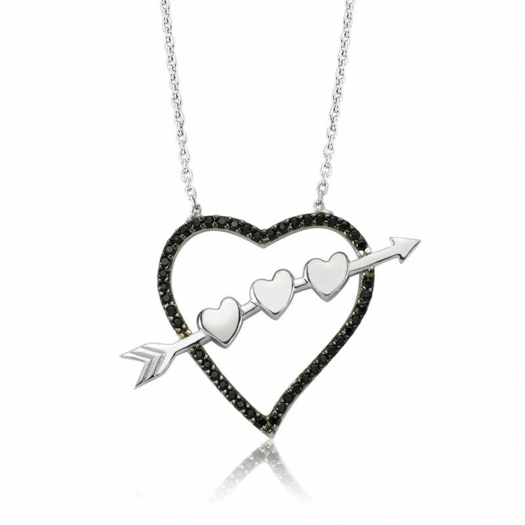 Kalbinizden vurulduğunuzu ve aşkla dolduğunuzu anlatan bu özel kalbe kalp oklarının saplandığı kolye sevdiğinize verebileceğiniz güzel bir hediye olacaktır. Sevgilinize doğum günü ve yıl dönümü günleri için romantik bir hediye arayışındaysanız, kadınların takmaktan çok hoşlanacağı kolye en anlamlı hediyelerden biri olacaktır. Oklu kalp kolye 925 ayar gümüşten imal edilmiştir. Gümüş üzerine rodyum kaplama yapılmıştır. Rodyum kaplama yapılan gümüş kolye modelleri parlaklığını uzun süre muhafaza eder ve oksitlenmesi gecikir. Kolye üzerinde bulunan taşlar zirkondur. Gümüş olan zincir boyu ortalama 45 cm'dir. Bu oklu kalp bayan kolye el emeği ile üretilmiştir. Gümüş ve değerli taşlar nedeniyle belirtilen ürün ağırlığında ± %10 sapma olabilmektedir.