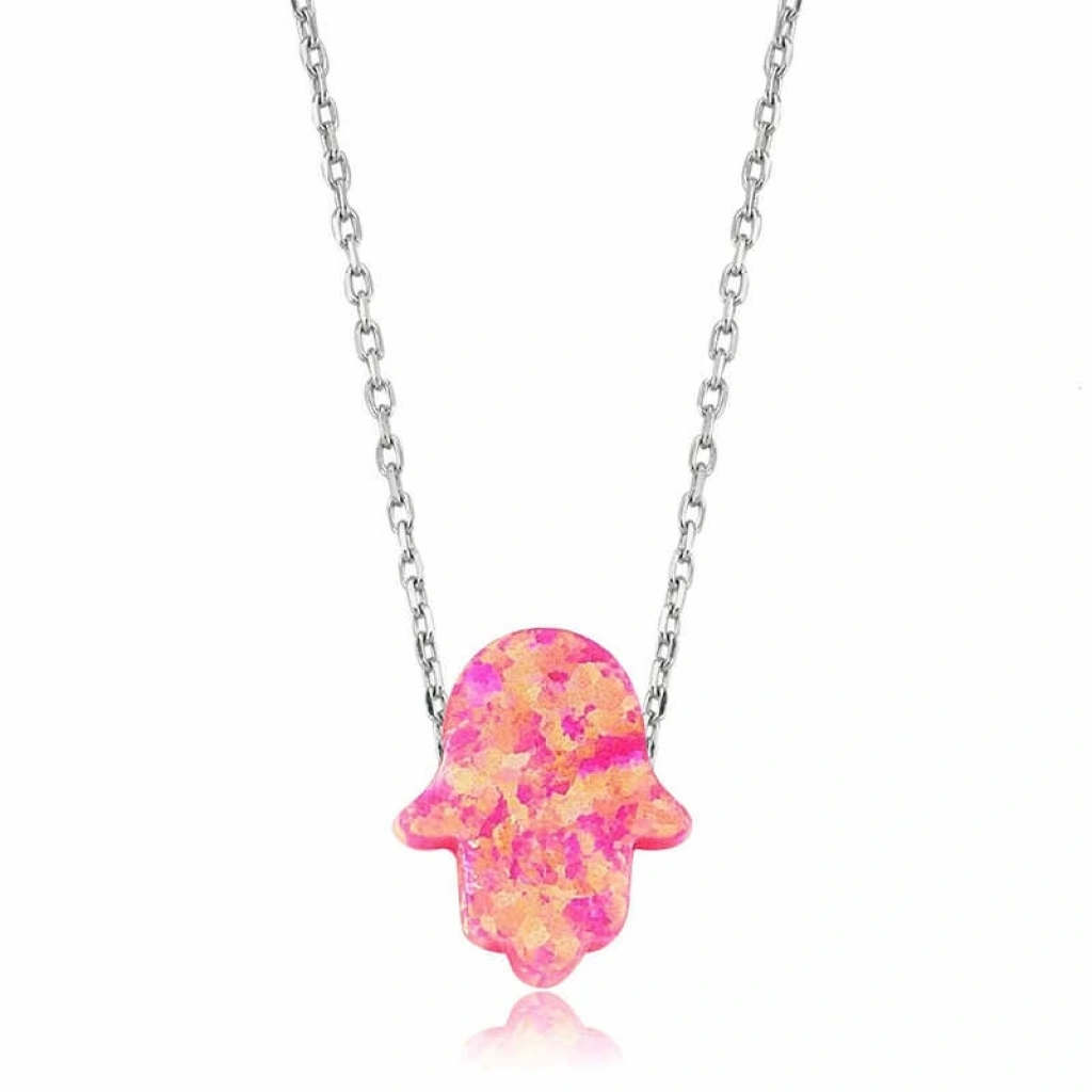 Hz. Fatma'nın Eli olarak bilinse de arapça'da “hamse” diye anılır. Hamse, beş anlamına gelir ve bir elin parmak sayısını gösterir. Hz. Fatma bir gün mutfakta helva kavururken, eşi Hz. Ali görür ve pişen helvaya elini daldırır ancak hiç bir şey olmaz, helvayı böyle kavurmayı devam eder. O günden sonra elinin kutsallığına, gücüne adeta yenilmezliğine inanılır. Her güçlük adeta onun eliyle aşılacaktır. Pembe opal fatma eli bayan kolye 925 ayar gümüşten imal edilmiştir. Gümüş üzerine rodyum kaplama yapılmıştır. Rodyum kaplama yapılan gümüş bayan kolye modelleri parlaklığını uzun süre muhafaza eder ve oksitlenmesi gecikir. Kolye sentetik opal taş ile yapılmıştır. Zincir boyu ortalama 45 cm'dir. Tüm gümüş bayan kolye modellerinde olduğu gibi gümüş pembe opal Fatma eli bayan kolye modeli de el emeği ile üretilmiştir. Gümüş ve değerli taşlar nedeniyle belirtilen ortalama ürün ağırlığında ± %10 sapma olabilmektedir.