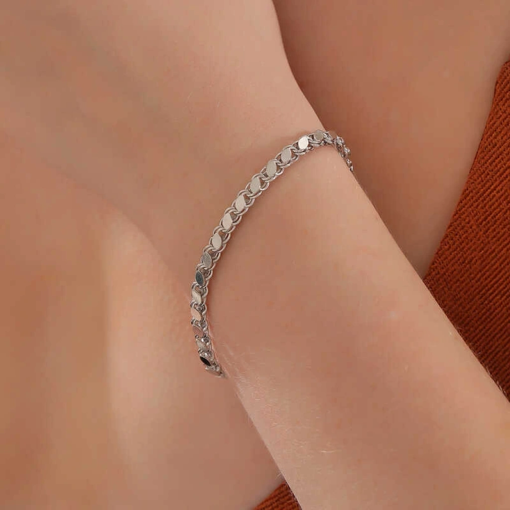 Günlük hayatında da bakımlı görünmek isteyen kadınların tercihi zincir bileklikler, en sade kıyafetlere dahi şıklık katıyor. Pullu zincir bileklikler zarifliği ve şıklığıyla göz doldurmaya devam ediyor. Şık ve spor her kombinle kullanılabilen geniş kullanım alanına sahip zincir bileklikler, tarzınızı özgürce oluşturmanızı sağlıyor. Gümüş pullu zincir bileklik üzerine rodyum kaplama yapılmıştır. Rodyum kaplama gümüşün kararmasının gecikmesini sağlamaktadır. Tüm gümüş modellerimizde olduğu gibi gümüş pullu zincir bileklik modeli de tamamen el emeği ile üretilmiştir. Gümüş ve değerli taşlar nedeniyle belirtilen ortalama ürün ağırlığında ± %10 sapma olabilmektedir.