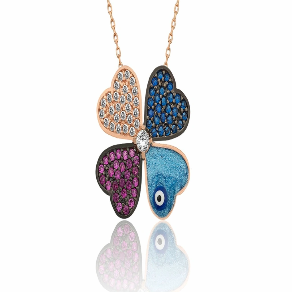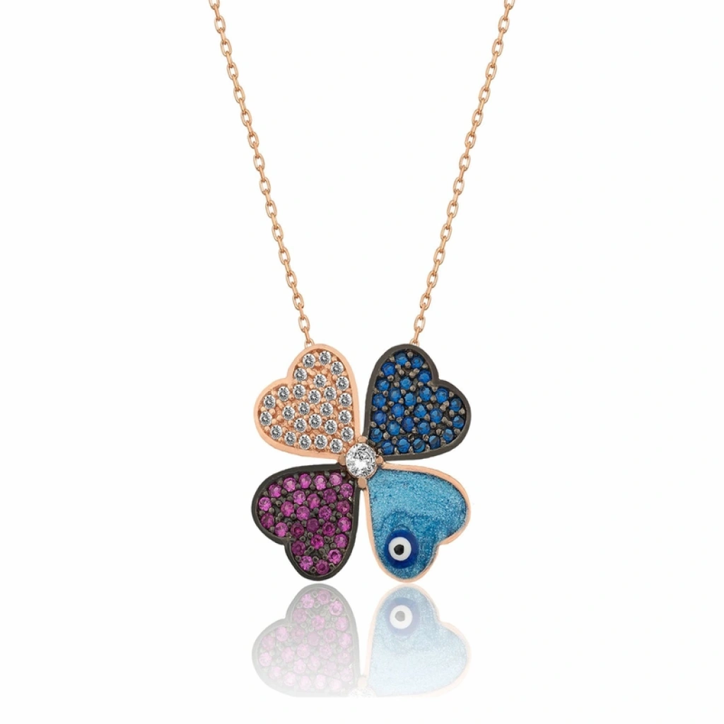Dört yapraklı yonca bütün kültürlerde iyi şansın sembolü olarak kabul edilir. Birinci yaprak ümidi, ikincisi imanı, üçüncüsü aşkı, dördüncü yaprak ise şansı simgeler. Tabiatta çok nadir bulunan bu dördüncü yapraktır. Siz de sevdiğiniz ve değer verdiğiniz kişiye bu anlamlı kolyeyi hediye edebilirsiniz. Bu şık kolye modeli 925 ayar gümüşten imal edilmiştir. Gümüş üzerine rose kaplama yapılmıştır. Rose kaplama yapılan gümüş kadın kolye modelleri palaklığını uzun süre muhafaza eder, oksitlenmesi gecikir. Kolye üzerindeki gümüş zincir 45 cm'dir. Gümüş kolye modellerinin tamamında olduğu gibi gümüş dört yapraklı yaonca kolye modeli de tamamen el emeği ile üretilmiştir. Gümüş ve değerli taşlar nedeniyle belirtilen ortalama ürün ağırlığında ± %10 sapma olabilmektedir.