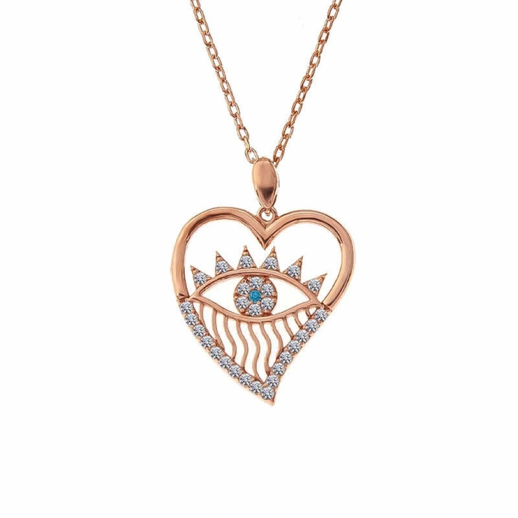 Kalp ve göz deseni taşlı olan bu harika tasarım kalp göz kolye modeli 925 ayar gümüşten imal edilmiştir. Kalp tasarımlı kolyeler aşkı çağrıştırır. Bu yüzden gümüş kalp göz kolye güzel bir hediye seçeneği de olabilir. Bu kolye üzerinde zirkon taşlar kullanılmıştır. Gümüşün üzerine oksitlenmesinin gecikmesi ve parlaklığını uzun süre muhafaza etmesi için rose kaplama yapılmıştır. Tamamen gümüş olan zincir uzunluğu ortalama 45 cm’dir. Bu kalp göz kadın kolye modeli diğer gümüş kalp göz kadın kolye modellerinde olduğu gibi el emeği ile üretilmiştir. Gümüş ve değerli taşlar nedeniyle belirtilen ortalama ürün ağırlığında ± %10 sapma olabilmektedir.