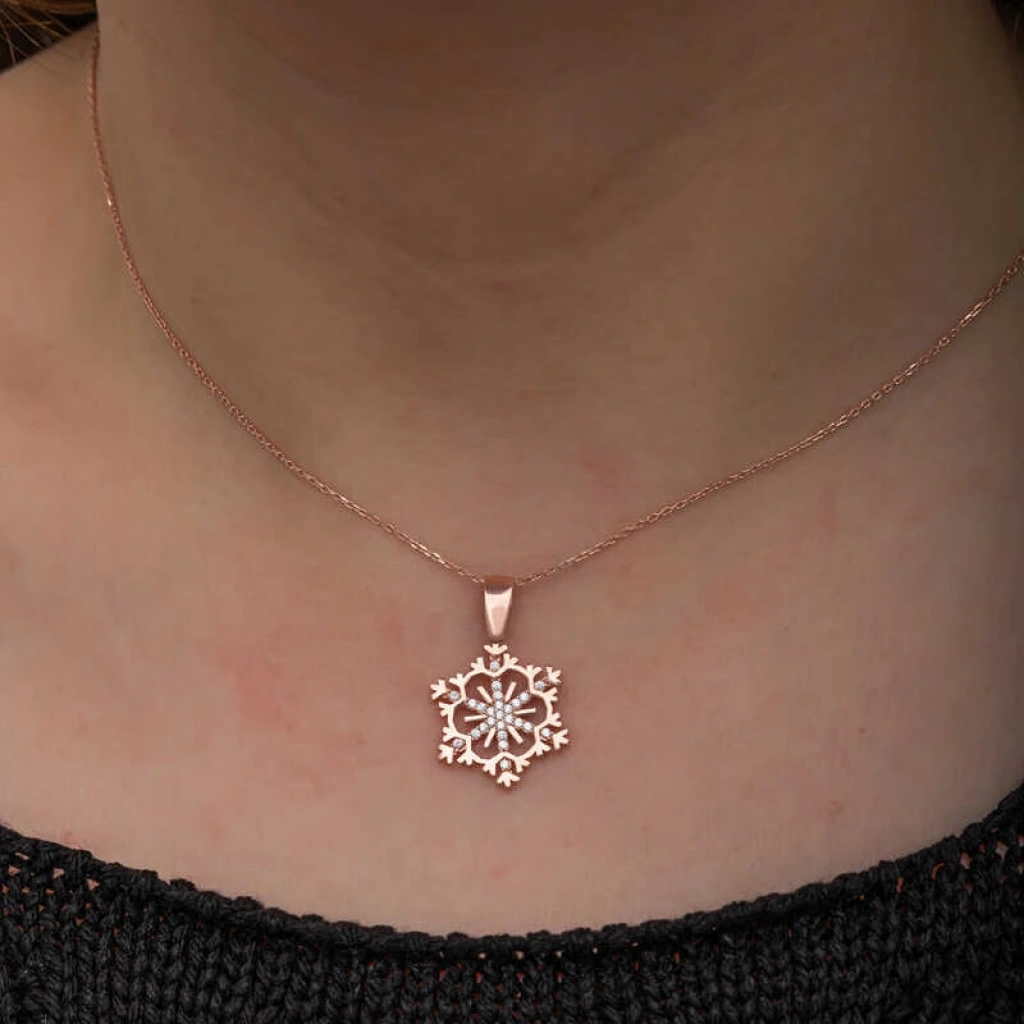 Kadınların ışıltısı, berraklığı kar tanesine benzetilip özel olarak tasarlanmıştır. Kar tanelerinin her birinin kadınlar gibi eşsiz ve ayrı kıymette olması onları özel kılan bir diğer özelliktir. Asilliği her dönemde dikkat çekmeyi başarmıştır. Bunun yanında insanların tıpkı kar taneleri gibi birbirlerine zarar vermeden de mutlu bir şekilde yaşayabileceklerini sembolize etmektedir. Bu şık kolye; doğum günü hediyesi, sevgililer günü hediyesi veya annelere hediye olarak özel günlerde tercih edilebilecek mükemmel bir seçenektir. Kolye, 925 ayar gümüşten imal edilmiştir. Gümüş üzerine rose kaplama yapılmıştır. Rose kaplama yapılan gümüş kadın kolye modelleri parlaklığını uzun süre muhafaza eder, oksitlenmesi gecikir. Zincir boyu ortalama 45 cm'dir. Tüm gümüş kadın kolye modellerinde olduğu gibi bu gümüş kar tanesi kadın kolye de tamamı el emeği ile üretilmiştir. Gümüş ve değerli taşlar nedeniyle belirtilen ortalama ürün ağırlığında ± %10 sapma olabilmektedir.