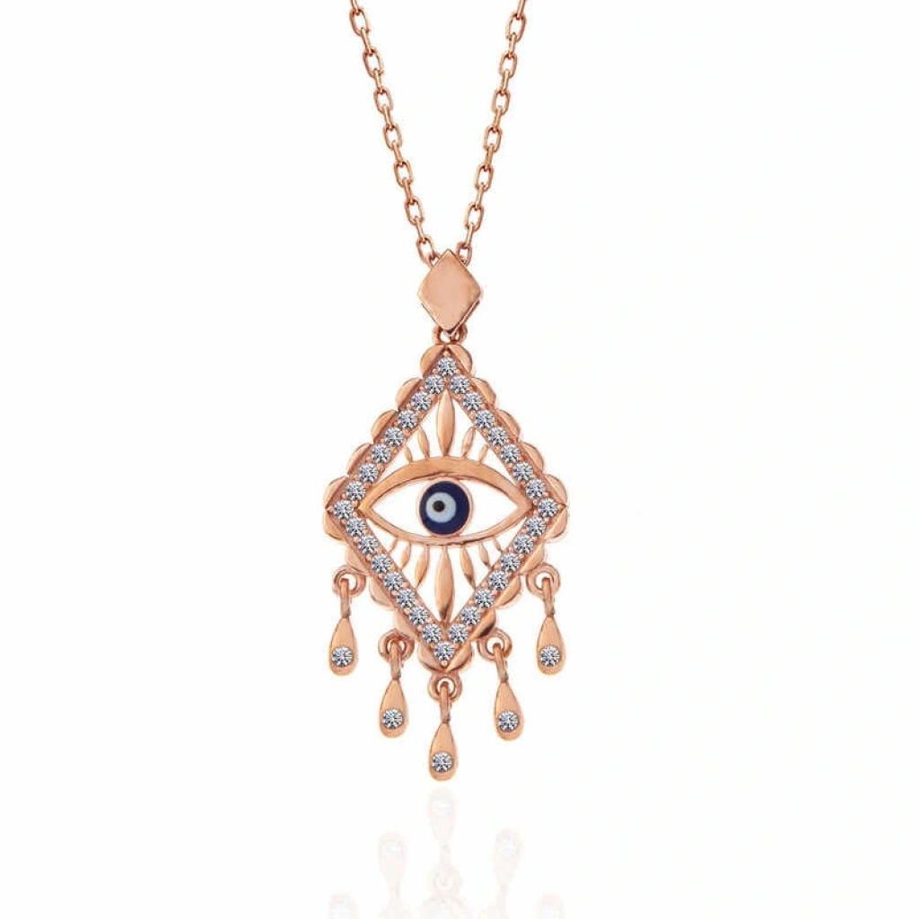 Birçok kültürde kötü enerjinin zararlarından korunmak için çeşitli tılsımlar kullanılmıştır. Doğu kültürlerinin çoğunda kullanılan tılsım ise gözdür. Nazar boncuğu da göz şeklinden ilham alınarak tasarlanmıştır. Mavi rengin seçilmesi de tesadüf değildir. Renkli gözlü kişilerin enerjisini daha etkili yansıttığı inancı gereği nazar boncukları çoğunlukla mavi olarak tasarlanır. Güzelliğiyle göz kamaştıran, nazardan korunmasını istediğiniz kişilere ve sevdiklerinize gümüş nazarlı göz kolyeyi armağan edebilirsiniz. Gümüş kolye üzerinde rose kaplama yapılmıştır. Rose kaplama yapılan gümüş kadın kolyeler parlaklığını uzun süre muhafaza eder, oksitlenmesi gecikir. Gümüş olan zincir boyu ortalama 45 cm'dir. Ürünlerimizin tamamı el emeği ile üretilmiştir. Gümüş ve değerli taşlar nedeniyle ürün ağırlığında ± %10 sapma olabilmektedir.