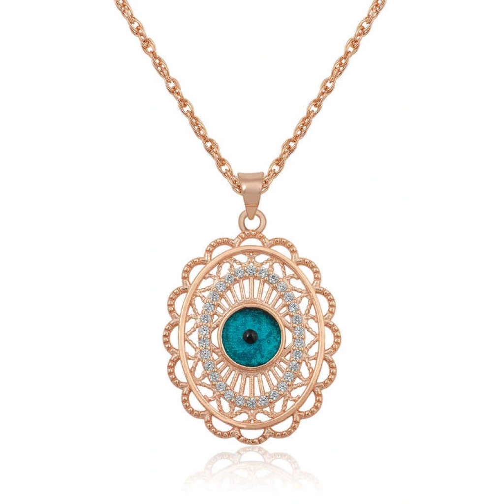 Günün her anında size eşlik edecek ve kombinlerinizi tamamlayabileceğiniz oval nazarlı gümüş kolye, şıklığınıza şıklık katacak bir aksesuar olacak. Bu şık kolye; doğum günü hediyesi, sevgililer günü veya özel günlerde tercih edilebilecek mükemmel bir seçenektir. Kolye; 925 ayar gümüşten imal edilmiştir. Üzerindeki taşlar zirkondur. Gümüş üzerine rose kaplama yapılmıştır. Rose kaplama yapılan ürünler gümüşe pembe bakır rengi verir. Diğer kolyelerde olduğu gibi gümüş oval nazar kolye de el emeği ile üretilmiştir. Gümüş ve değerli taşlar nedeniyle belirtilen ortalama ürün ağırlığında ± %10 sapma olabilmektedir.