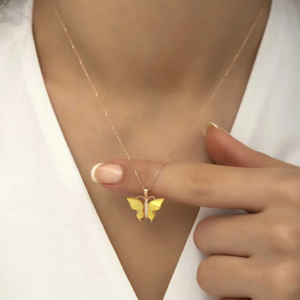 Gümüş Rose Sarı Kaplangözü Taşlı Kelebek Kolye