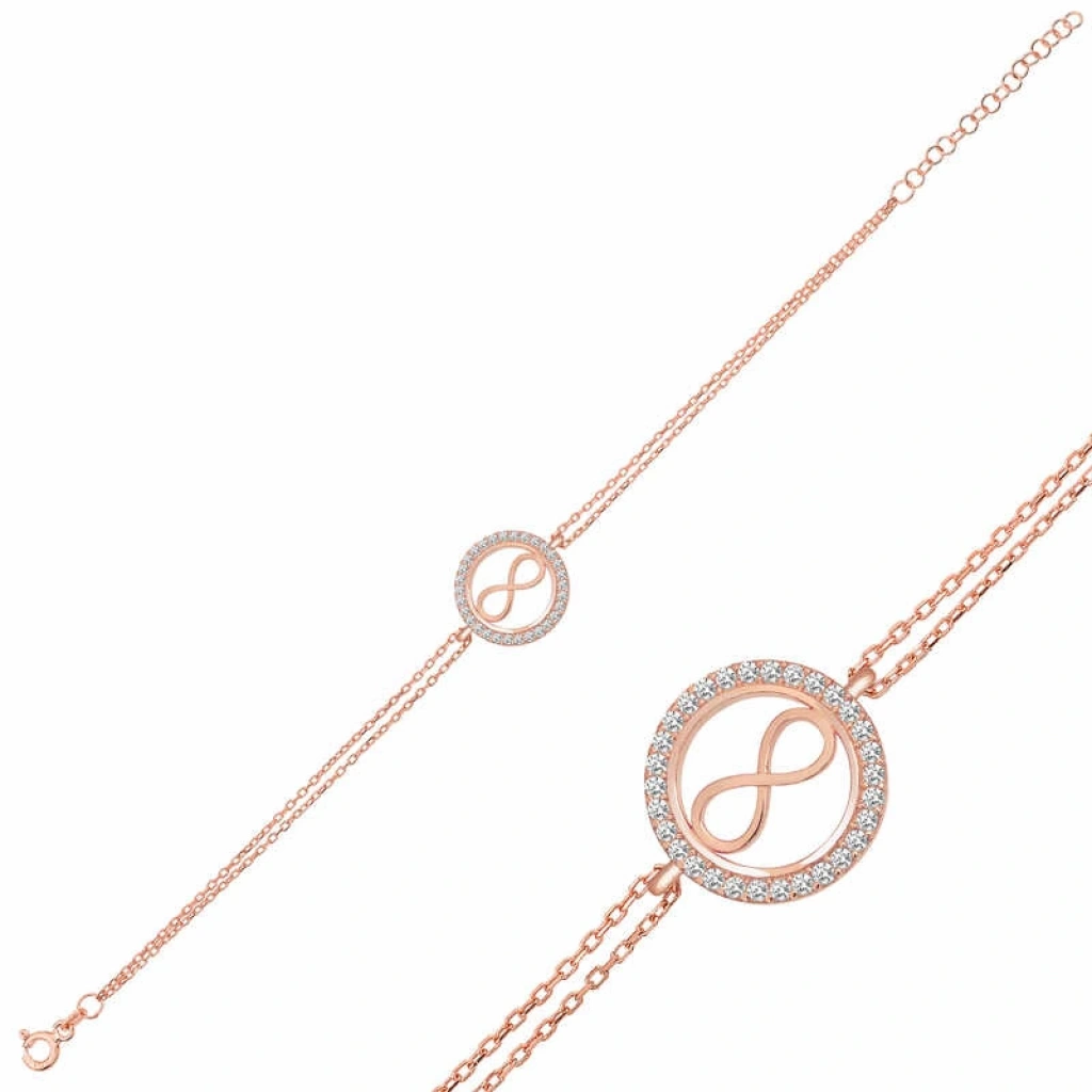 Gümüş zirkon taşlar ve sonsuzluk modelinin bir araya geldiği sevdiklerinize sevginizi gösterebileceğiniz şık ve anlamlı bir hediye olacaktır. Bu sonsuzluk model bileklik üzerine rose kaplama yapılmıştır. Rose kaplama yapılan gümüş bayan bileklik modelleri parlaklığını uzun süre muhafaza eder ve oksitlenmesi gecikir. Bayan bileklik modellerinin tamamında olduğu gibi gümüş sonsuzluk bayan bileklik modeli de el emeği ile üretilmiştir. Gümüş ve değerli taşlar nedeniyle belirtilen ortalama ürün ağırlığında ± %10 sapma olabilmektedir.