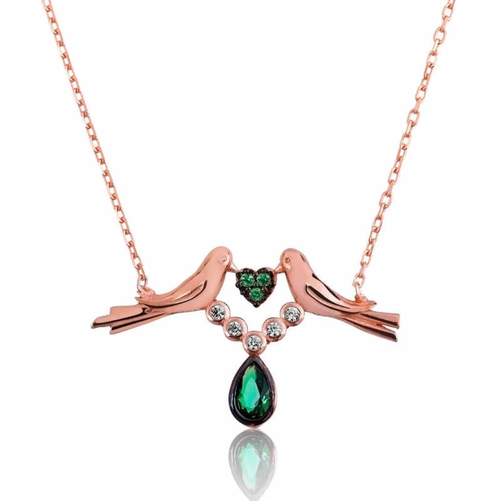 Kalp deseniyle aşkı ifade eden bu kolye ile sevginiz, sevdiğiniz kadının teninde hayat bulsun. Aşık kuşların bağlılıklarını anlatan bu şık kolye; 925 ayar gümüşten imal edilmiştir. Gümüş üzerine rose altın kaplama yapılmıştır. Rose altın kaplama yapılan gümüş kolyeler parlaklığını uzun süre muhafaza eder ve oksitlenmesi gecikir. Kolye üzerinde bulunan taşlar zirkondur. Gümüş olan zincir boyu ortalama 45 cm'dir. Tüm kolyelerde olduğu gibi gümüş sevgi kuşu kolye modeli de el emeği ile üretilmiştir. Gümüş ve değerli taşlar nedeniyle belirtilen ortalama ürün ağırlığında ± %10 sapma olabilmektedir.