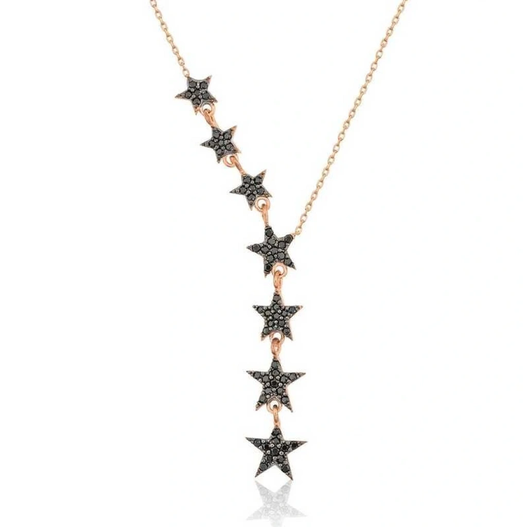 Gecenin parlak ışıltısını anımsatan yıldız, sembolik olarak evrenin sonsuzluğunu, uzaktaki bir noktayı ifade eder. Parıltının, ışığın, aydınlığın ve umudun sembolüdür. Her insan özel, her sevilen eşsizdir. Eşsiz sevginin ömür boyu sürecek birlikteliğin simgesi gümüş sıralı yıldızlar kolye ile sevdiklerinizi mutlu etmeye ne dersiniz... Kolye 925 ayar gümüşten imal edilmiştir. Gümüş üzerine rose altın kaplama yapılmıştır. Rose altın kaplama yapılan gümüş kolyeler parlaklığını uzun süre muhafaza eder, gümüş rengini pembe renge dönüştürür ve oksitlenmeyi geciktirir. Üzerinde bulunan siyah taşlar zirkondur. Gümüş kolye modellerinin tamamında olduğu gibi gümüş siyah kayan yıldızlar kolye modeli de el emeği ile üretilmiştir. Gümüş ve değerli taşlar nedeniyle belirtilen ortalama ürün ağırlığında ± %10 sapma olabilmektedir.