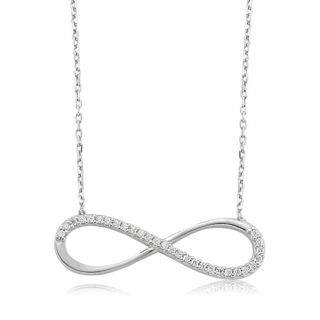 Sevgilinize sonsuz aşkı ifade etmenin en güzel, en anlamlı yollarından biri de ona sonsuzluk temalı gümüş takılar hediye etmektir. Sevgilinize hediye edeceğiniz bu özel kolye ile ona olan sonsuz aşkınızı sevginizi ifade edebilir sonsuza kadar birlikte olacağınız mesajı verebilirsiniz. Sonsuzluk bayan kolye modeli 925 ayar gümüşten imal edilmiştir. Gümüş üzerine rodyum kaplama yapılmıştır. Rodyum kaplama yapılan gümüş bayan kolye modelleri parlaklığını uzun süre muhafaza eder ve oksitlenmesi gecikir. Kolye üzerinde bulunan taşlar zirkondur. Gümüş olan zincirin boyu ortalama 45 cm'dir. Tüm gümüş bayan kolye modellerinde olduğu gibi gümüş sonsuzluk bayan kolye modeli de el emeği ile üretilmiştir. Gümüş ve değerli taşlar nedeniyle belirtilen ürün ağırlığında ± %10 sapma olabilmektedir.