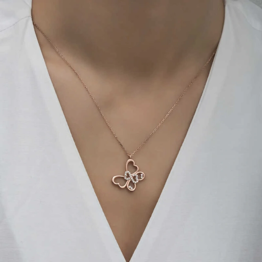Kelebek kolye tertemiz sevginin ve aşkın ifadesidir. Sonsuz sevginizi sevdiğinize gösterebileceğiniz bir kolye modelidir. Sevdiklerinize alabileceğiniz anlamlı bir hediye bu şık kelebek kadın kolye 925 ayar gümüşten imal edilmiştir. Gümüş üzerine rose kaplama yapılmıştır. Rose kaplama yapılan gümüş kadın kolye modelleri parlaklığını uzun süre muhafaza eder ve oksitlenmesi gecikir. Kolye üzerinde bulunan beyaz taşlar zirkondur. Gümüş olan zincir boyu ortalama 45 cm'dir. Gümüş sonsuzluk kelebek kadın kolye modeli diğer tüm gümüş kadın kolye modellerinde olduğu gibi el emeği ile üretilmiştir. Gümüş ve değerli taşlar nedeniyle belirtilen ortalama ürün ağırlığında ± %10 sapma olabilmektedir.