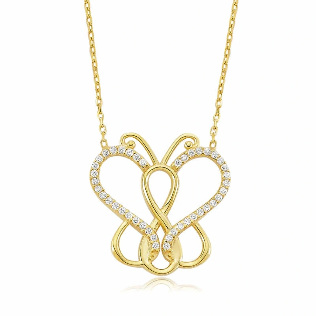 Kelebek kolye tertemiz sevginin ve aşkın ifadesidir. Sonsuz sevginizi sevdiğinize gösterebileceğiniz bir kolye modelidir. Sevdiklerinize alabileceğiniz anlamlı bir hediye bu şık kelebek bayan kolye 925 ayar gümüşten imal edilmiştir. Gümüş üzerine altın kaplama yapılmıştır. Altın kaplama yapılan gümüş bayan kolye modelleri parlaklığını uzun süre muhafaza eder ve oksitlenmesi gecikir. Kolye üzerinde bulunan beyaz taşlar zirkondur. Gümüş olan zincir boyu ortalama 45 cm'dir. Gümüş sonsuzluk kelebek bayan kolye modeli diğer tüm gümüş bayan kolye modellerinde olduğu gibi el emeği ile üretilmiştir. Gümüş ve değerli taşlar nedeniyle belirtilen ortalama ürün ağırlığında ± %10 sapma olabilmektedir.