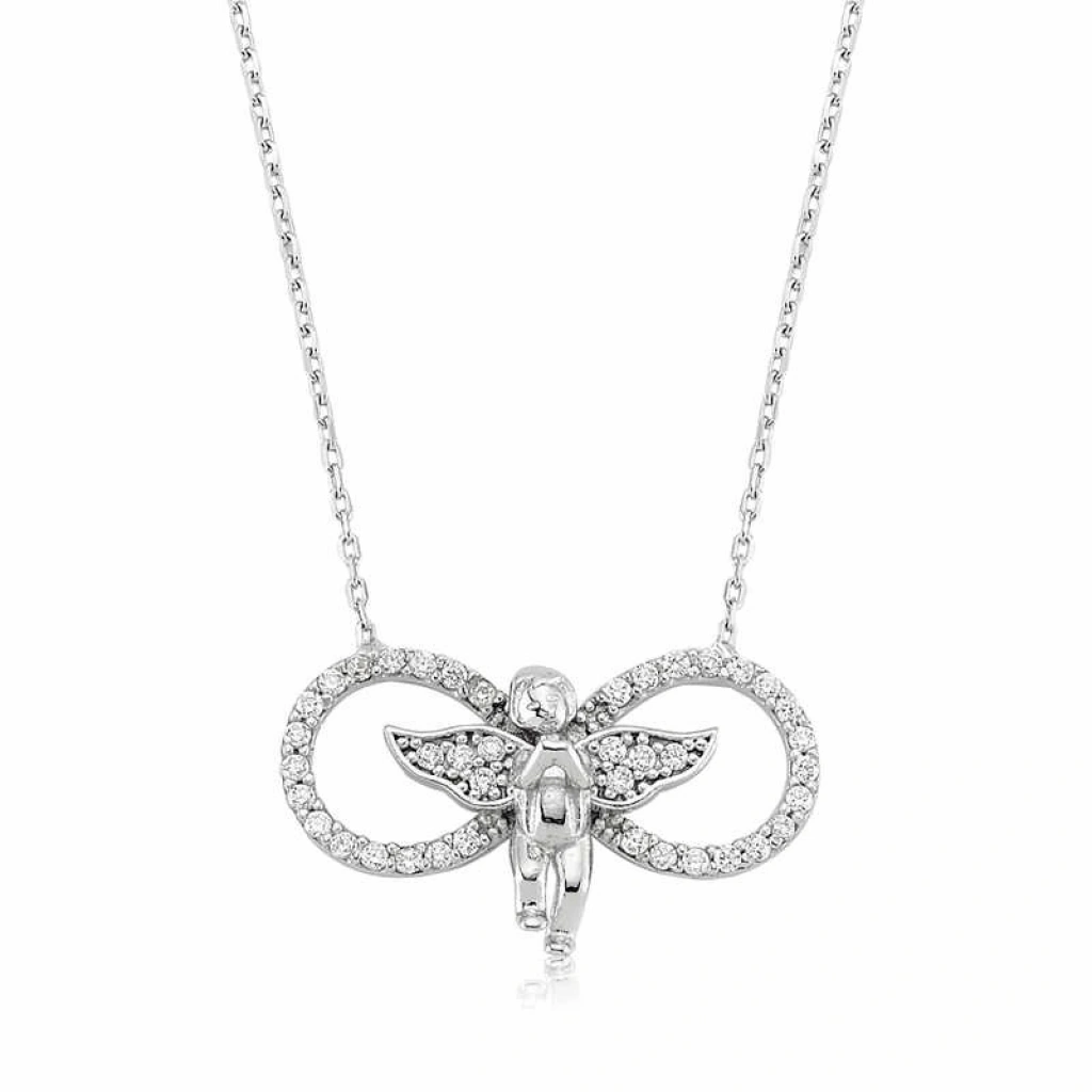 Melek kolyeler tüm duyguları eksiksiz ifade eden son derece çarpıcı hediye seçenekleridir. Aşk meleği Eros ise aşkını bir türlü itiraf edemeyen kişilere yardımcı olması açısından çok fazla tercih edilmektedir. Sonsuzluk içindeki melek kolye sevdiğiniz kişiye verdiğiniz değer ve aşkın hiçbir zaman bitmeyeceğini ifade etmektedir. Duygularınızı eksiksiz ifade etmek istiyorsanız siz de bu kolyeyi tercih edebilir sevdiklerinizi sevindirebilirsiniz. Sonsuzluk melek bayan kolye modeli 925 ayar gümüşten imal edilmiştir. Gümüş üzerine rodyum kaplama yapılmıştır. Rodyum kaplama yapılan gümüş bayan kolye modelleri parlaklığını uzun süre muhafaza eder ve oksitlenmesi gecikir. Kolye üzerinde bulunan taşlar zirkondur. Gümüş olan zincir boyu ortalama 45 cm'dir. Tüm gümüş bayan kolye modellerinde olduğu gibi gümüş sonsuzluk melek bayan kolye modeli de el emeği ile üretilmiştir. Gümüş ve değerli taşlar nedeniyle belirtilen ürün ağırlığında ± %10 sapma olabilmektedir.