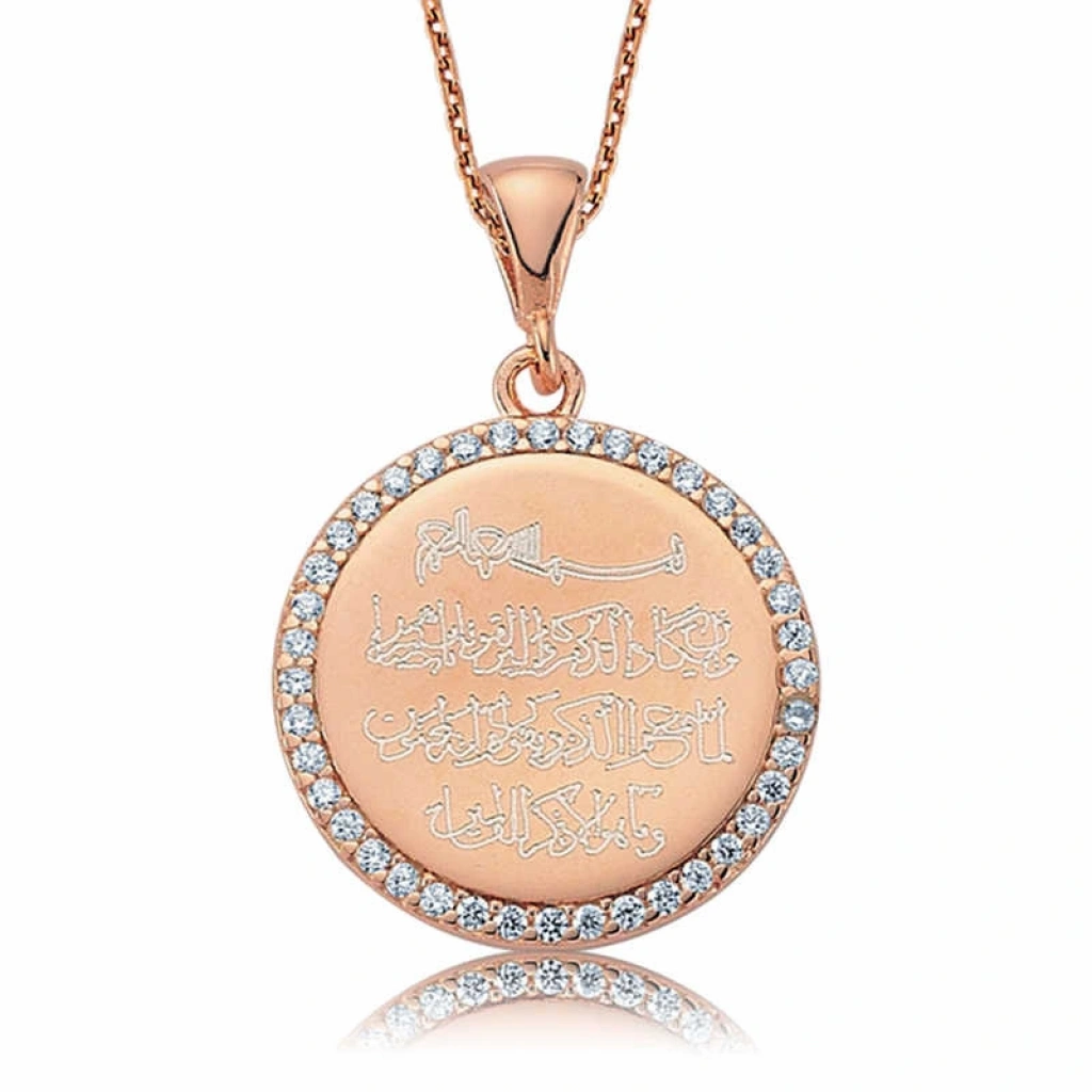 Nazar bakış demektir ve her canlıya nazar değebilmektedir. Bu nazar hastalığından korunmak, şifa bulmak için nazar duası okunur... Bu maneviyatı yüksek kolye; doğum günü hediyesi, sevgililer günü hediyesi veya annelere hediye olarak özel günlerde tercih edilebilecek mükemmel bir seçenektir. Kolye; 925 ayar gümüşten imal edilmiştir. Kolye üzerine rose altın kaplama yapılmıştır. Rose altın kaplama yapılan ürünler parlaklığını uzun süre muhafaza eder, gümüşü pembe renge dönüştürür ve oksitlenmeyi geciktirir. Kolye üzerinde bulunan taşlar zirkondur. Tüm gümüş kolyelerde olduğu gibi gümüş taşlı nazar duası kolye de el emeği ile üretilmiştir. Gümüş ve değerli taşlar nedeniyle belirtilen ortalama ürün ağırlığında ± %10 sapma olabilmektedir.
