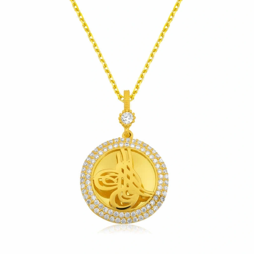 Osmanlı Devleti ve İmparatorluğu'ndaki padişahların imza olarak da kullandığı tuğra sembolü gümüş ile birleşerek anlamlı bir kolye haline gelmiştir. Böylelikle sevdiklerinizi veya kendinizi dini ve derin bir anlama sahip olan bu gümüş Tuğra armalı kolye ile sevindirebilirsiniz. Kolye 925 ayar gümüşten imal edilmiştir. Gümüş üzerine altın kaplama yapılmıştır. Altın kaplama yapılan gümüş kolye modelleri parlaklığını uzun süre muhafaza eder, gümüşe altın rengini verir. Kolye üzerinde bulunan taşlar zirkondur. Zincir uzunluğu ortalama 50 cm'dir. Ürünlerimizin tamamı el emeği ile üretilmiştir. Gümüş ve değerli taşlar nedeniyle belirtilen ortalama ürün ağırlığında ± %10 sapma olabilmektedir.
