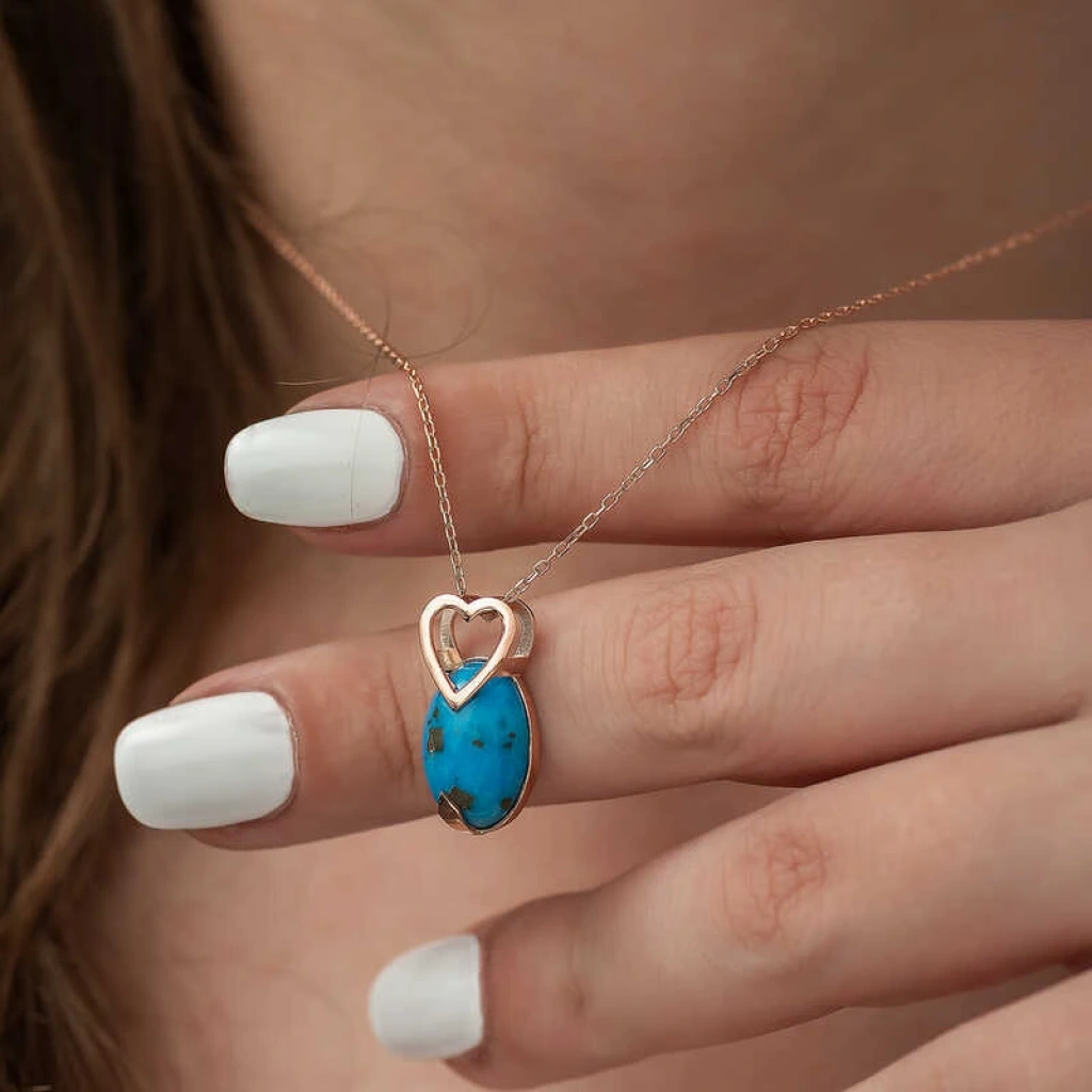 Gümüş Turkuaz Taşlı Kalp Kolye