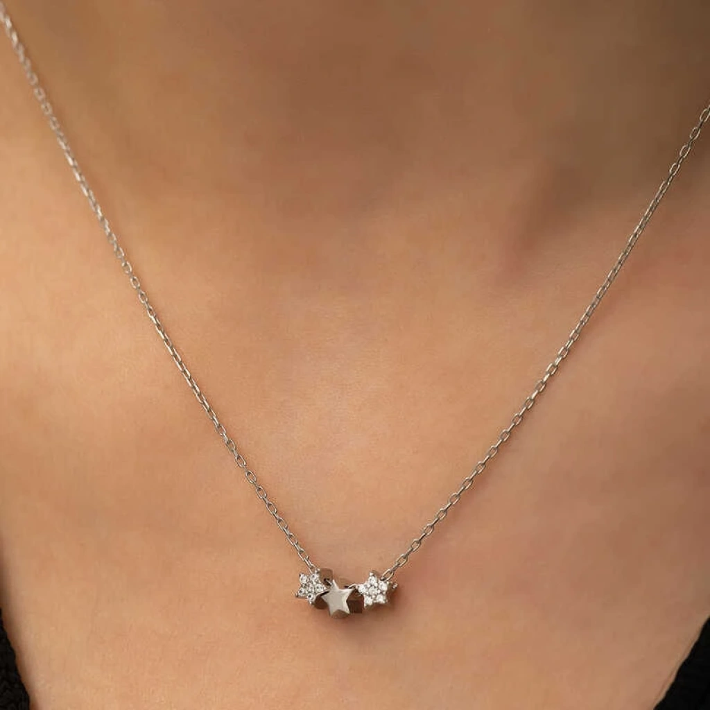 Yıldız, pek çok toplumda ve öğretide şans getirildiğine inanılan uğurlu bir semboldür. Venüs Gezegeninin enerjisini taşır. Venüs Gezegeni, aşk ve aşk enerjisinin de temsilcisidir. Bu şık kolye; doğum günü hediyesi, sevgililer günü hediyesi veya annelere hediye olarak özel günlerde tercih edilebilecek mükemmel bir seçenektir. Gümüş üç yıldız kolye 925 ayar gümüşten imal edilmiştir. Bu kolye üzerinde rodyum kaplama vardır. Rodyum kaplama yapılan gümüş kolye modelleri parlaklığını uzun süre muhafaza eder. Tüm gümüş kolye modellerimizde olduğu gibi gümüş üç yıldız kolye modeli de el emeği ile üretilmiştir. Gümüş ve değerli taşlar nedeniyle belirtilen ortalama ürün ağırlığında ± %10 sapma olabilmektedir.