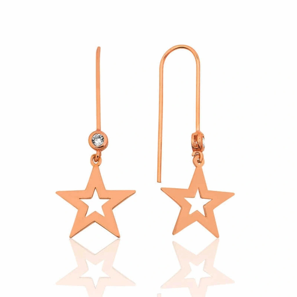Gecenin parlak ışıltısını anımsatan yıldız, sembolik olarak evrenin sonsuzluğunu, uzaktaki bir noktayı ifade eder. Parıltının, ışığın, aydınlığın ve umudun sembolüdür. Her aşk özel, her sevilen eşsizdir. Eşsiz aşkların ömür boyu sürecek birlikteliği yıldız figürlü gümüş küpe ile sevdiğiniz kadının teninde hissettirmeye ne dersiniz... 925 ayar gümüşten imal edilmiştir. Gümüş üzerine rose altın kaplama yapılmıştır. Rose altın kaplama yapılan ürünler parlaklığını uzun süre muhafaza eder, gümüş rengini pembe renge dönüştürür ve oksitlenmeyi geciktirir. Üzerinde bulunan taşlar zirkondur. Ürünlerimizin tamamı el emeği ile üretilmiştir. Gümüş ve değerli taşlar nedeniyle belirtilen ortalama ürün ağırlığında ± %10 sapma olabilmektedir.