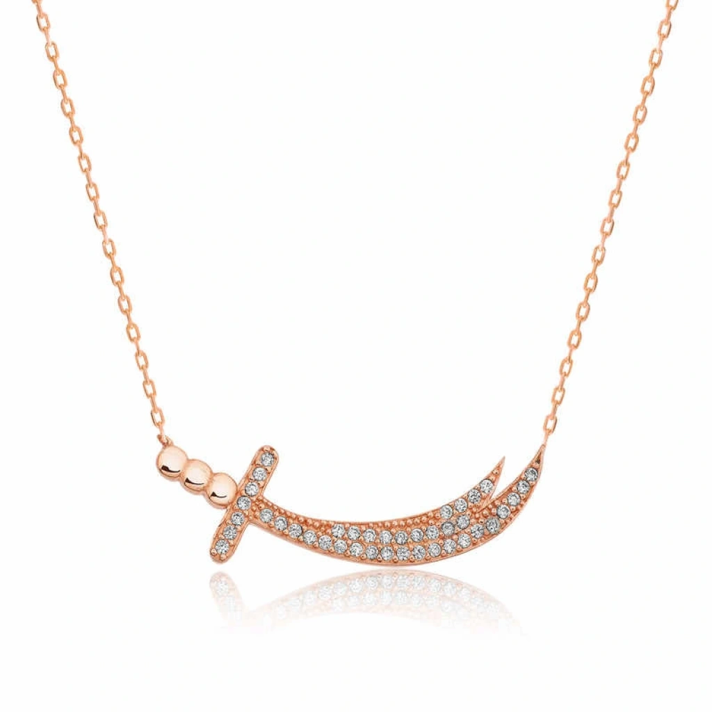 Tarihçilere göre Mısır Melik'i Mukavkas bu kılıcı Hz. Muhammed'e hediye etmiştir. Amrû bin Adûd, savaşta kendisine karşı çıkacak bir savaşçı istediğinde Peygamber, Ali'ye bu kılıcı uzatarak onun karşısına çıkmasına izin vermiştir. Hz. Ali'nin Uhud savaşında Kureyş’in önde gelen savaşçılarından dokuz kişiyi öldürdüğü, bu savaşta bedeninden yetmiş yara alarak son ana kadar Hz. Muhammed'i savunduğu, bu sebeple de Cebrail'in, “Zülfikar'dan keskin kılıç, Ali’den büyük yiğit yoktur.” "Lâ fetâ illâ Ali, lâ seyfe illâ Zülfikâr" dediği rivayet edilir. Ali'nin vasiyeti üzerine Necef'te denize atıldığı belirtilmiştir. Zülfikar kılıcı kolye modeli 925 ayar gümüşten imal edilmiştir. Gümüş üzerine rose altın kaplama yapılmıştır. Rose altın kaplama yapılan gümüş kolye modelleri parlaklığını uzun süre muhafaza eder. Ürünlerimizin tamamında olduğu gibi gümüş zülfikar kılıcı kolye modeli de el emeği ile üretilmiştir. Gümüş ve değerli taşlar nedeniyle beliritlen ortalama ürün ağırlığında ± %10 sapma olabilmektedir.