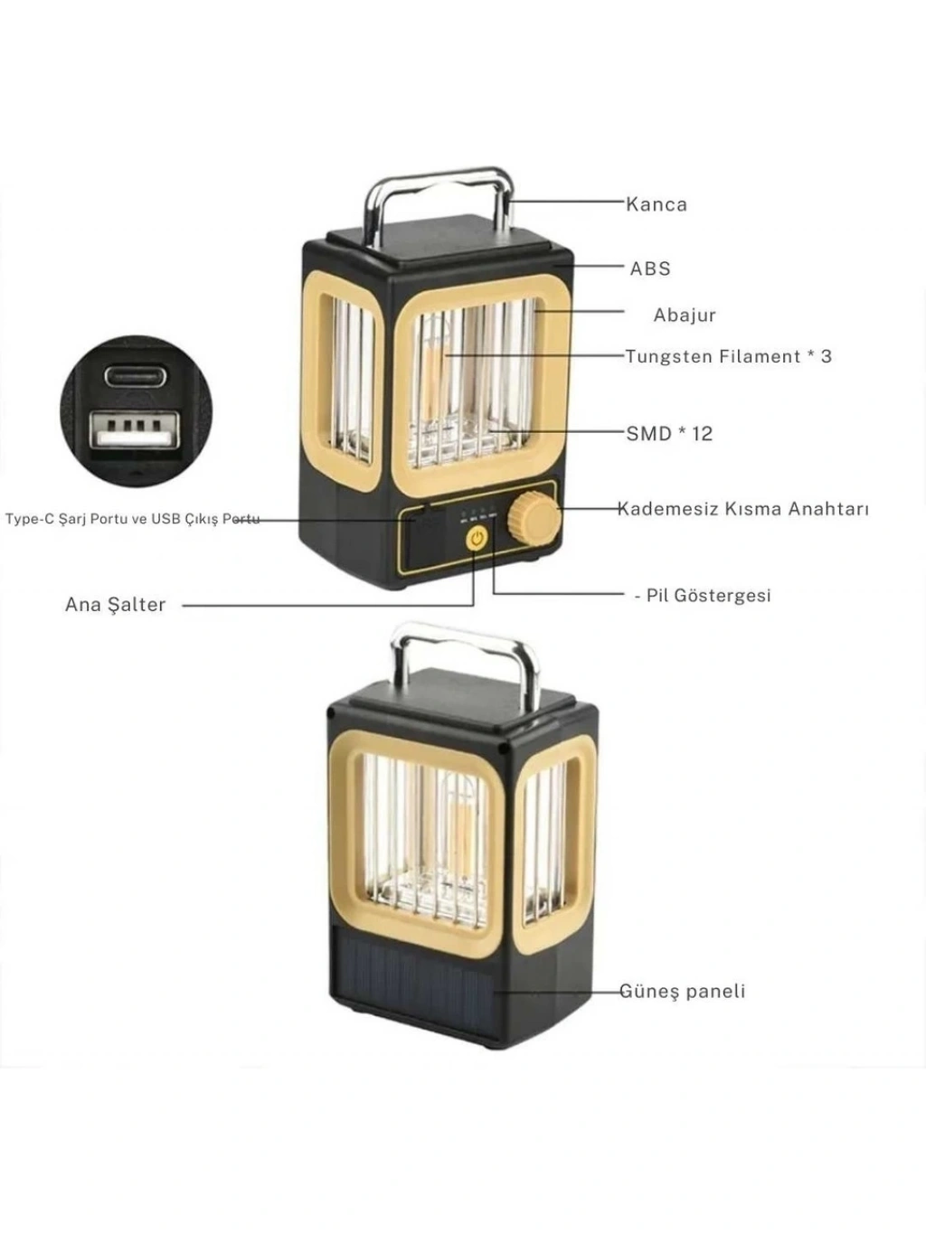 IP65 su geçirmezlik derecesi sayesinde yağmur ve toza karşı dayanıklı olan bu lamba, zorlu hava koşullarında bile güvenle kullanılabilir. ABS gövde malzemesi, hafifliği ve dayanıklılığı ile uzun ömürlü kullanım sunar. Lityum şarj edilebilir pil ile çalışan taşınabilirliği ve kolay kullanımıyla kamp, açık hava etkinlikleri ve acil durumlar için mükemmel bir tercihtir.
