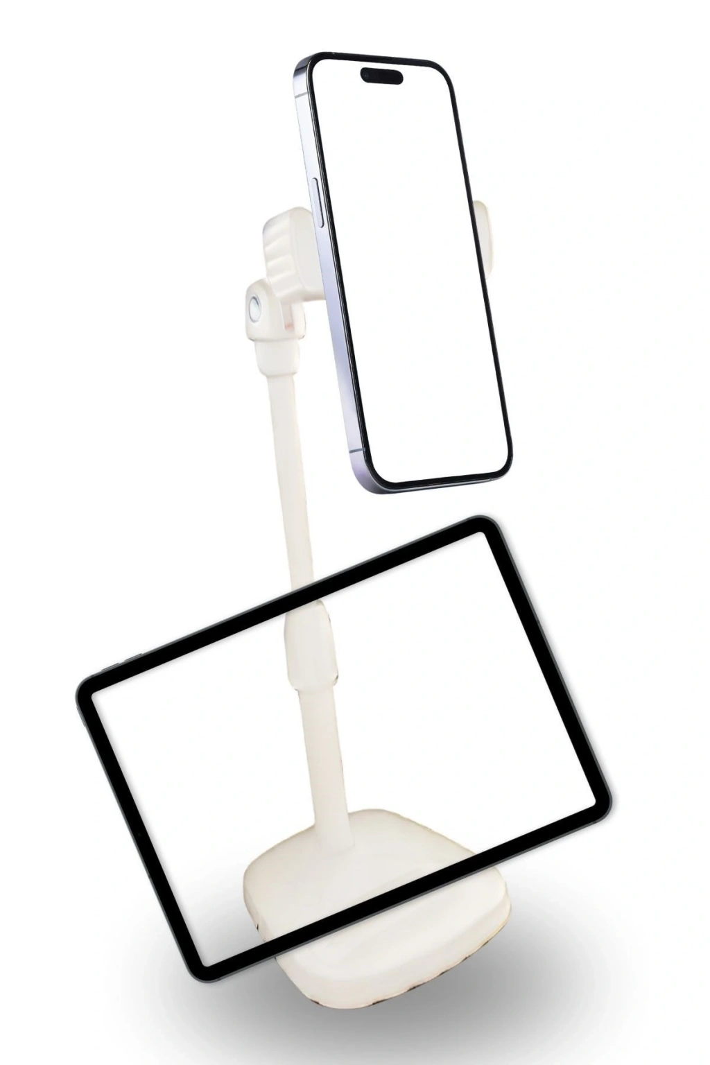 Masa Üstü Tablet ve Telefon Tutucu Plastik Aparat, Beyaz renkli şık tasarımı ile hem tablet hem de telefonlarınız için ideal bir stand çözümüdür. Çalışma masasında, mutfakta, yatak odasında veya ofiste, cihazlarınızı dik ya da yatay konumda sabit tutarak kullanım kolaylığı sağlar.