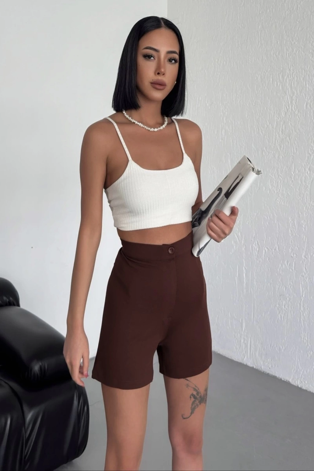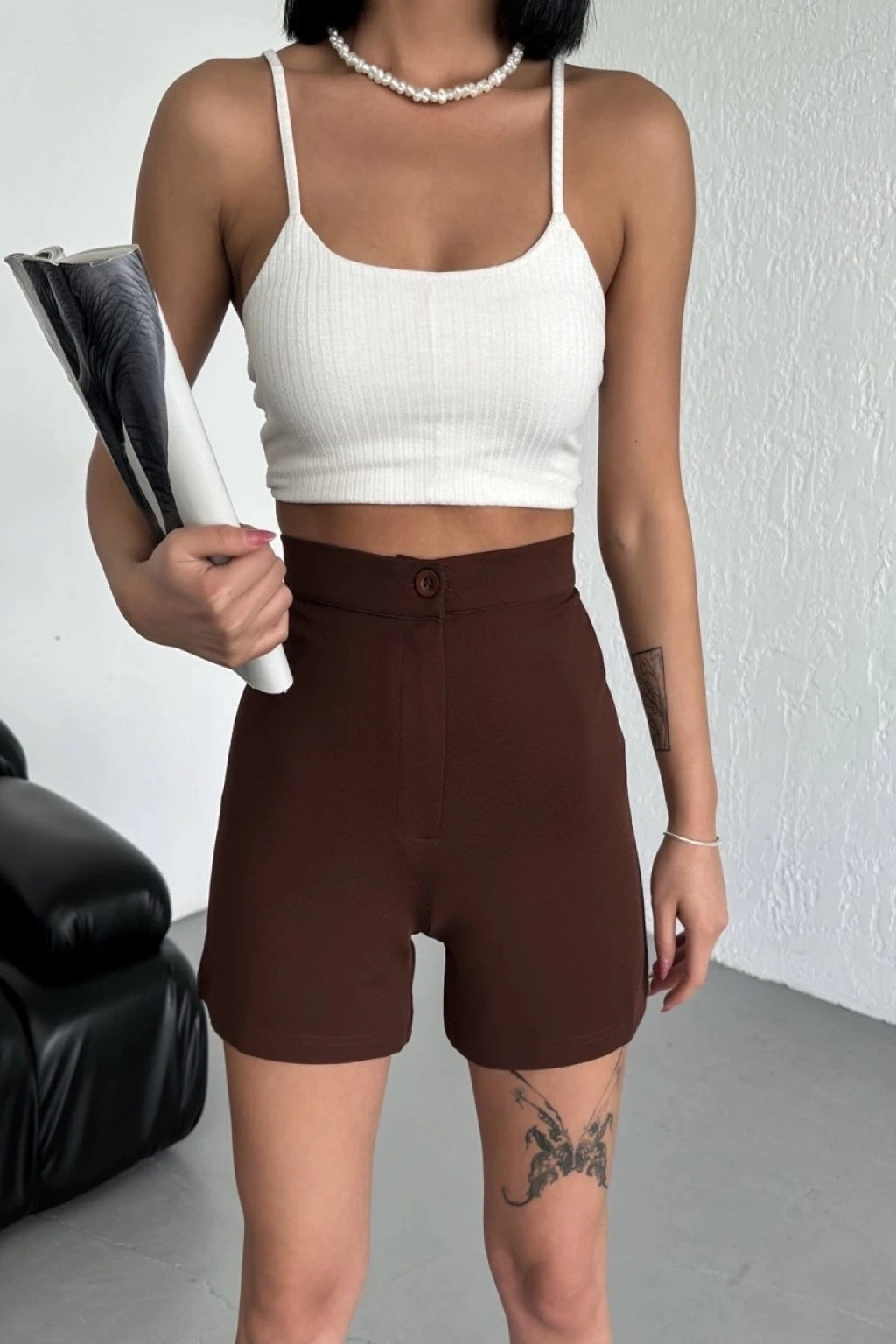 -Yazın serin rüzgarlarını hissetmek isteyenler için tasarlanan kahverengi yüksek bel esnek likralı krep şort, hafifliği ve rahatlığı bir arada sunuyor! Likralı kumaşı, hareket özgürlüğünüzü kısıtlamadan gün boyu konfor sağlarken, kahverengi rengiyle ferahlık ve tarzı birleştiriyor.