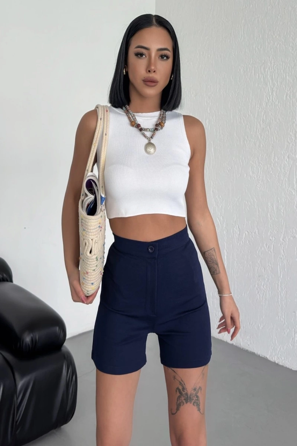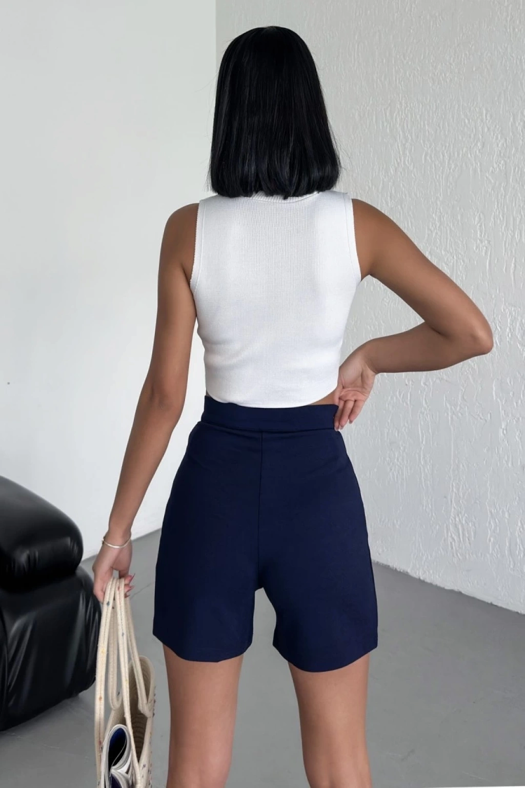 -Bu lacivert krep şort, plaj günlerinden sokak stilinize kadar her ortamda mükemmel uyum sağlayacak şekilde tasarlandı. Esneklik ve nefes alabilirlik sunan dokusu, sıcak havalarda serin kalmanızı sağlarken, yüksek bel tasarımı da mükemmel bir uyum ve şıklık katıyor.