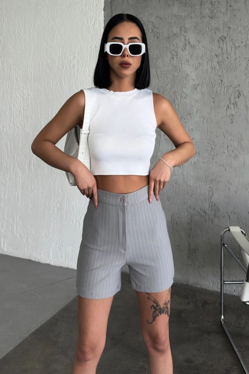 -Bu şık yüksek bel krep çımalı çizgili şort, gri tonuyla zamansız bir şıklık sunuyor. Esnek likralı kumaşı ve şık tasarımıyla hem rahatlık hem de tarz arayanların favorisi olmaya aday.