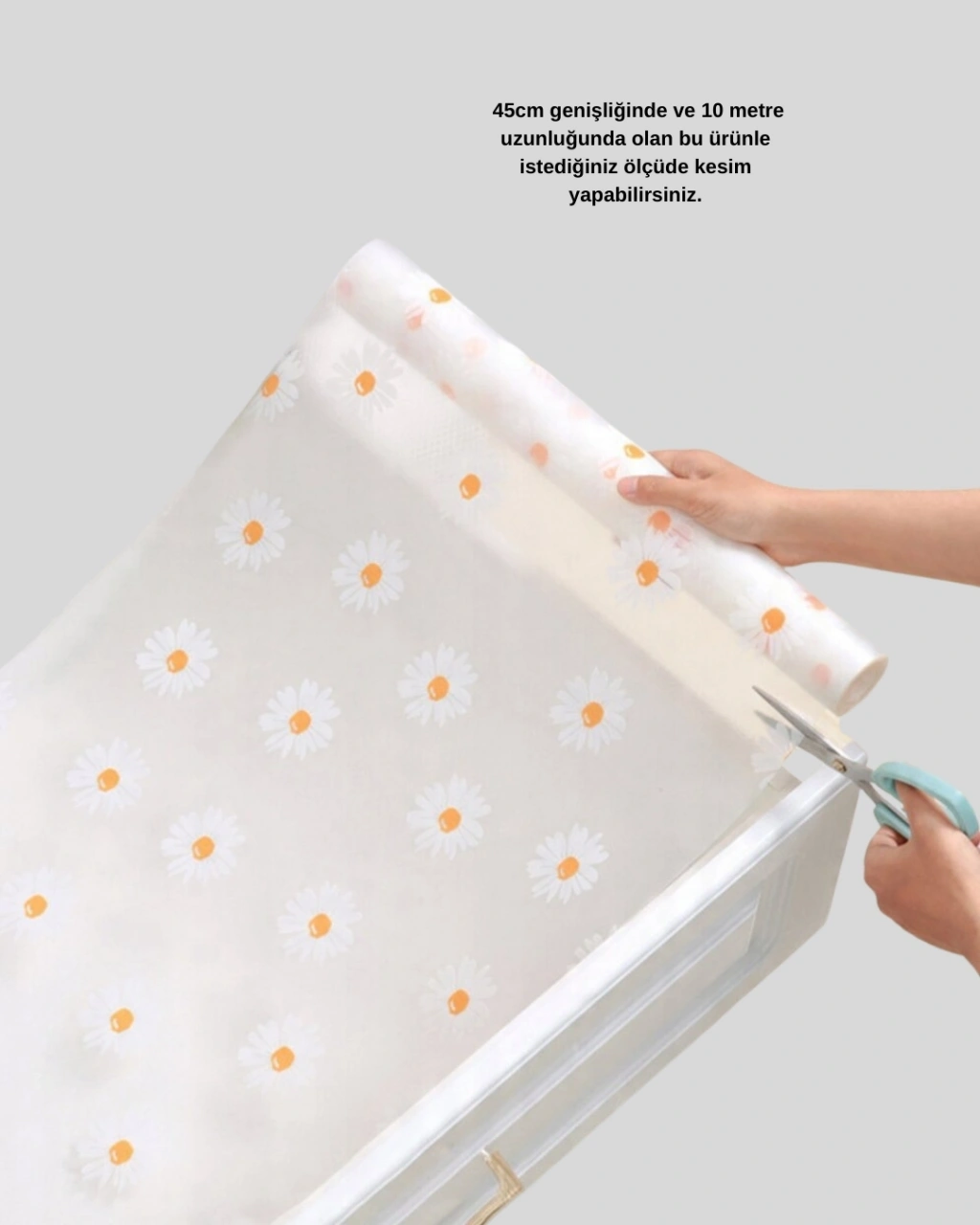 Çekmece ve dolap içlerinde düzeni sağlamak, yüzeyleri korumak ve eşyalarınızı güvenle saklamak için tasarlanan bu papatya desenli kaymaz çekmece içi mat, pratik kullanımı ve dekoratif görünümüyle öne çıkar. Ürün 10 metre uzunluğa sahiptir ve tek parça halinde gönderilir. Bu uzunluk sayesinde geniş çekmecelerde kesintisiz kullanım sağlar; aynı zamanda ihtiyaca göre kesilerek birden fazla çekmecede rahatlıkla kullanılabilir.Papatya desenli tasarımı, sade ve ferah bir görünüm sunarak mutfak, banyo ve yaşam alanlarına es bir dokunuş katar. Şeffaf yapısı sayesinde çekmece içindeki eşyalar kolayca görülebilir. Kaşık, çatal, mutfak gereçleri, kozmetik ürünleri, takılar ve kırtasiye malzemeleri için ideal bir düzenleme çözümüdür.Kaymaz yüzeyi sayesinde çekmece açılıp kapatıldığında mat yerinden oynamaz, eşyalar sabit kalır. Yapışkan içermeyen yapısı, yüzeylerde iz veya kalıntı bırakmaz. Kullanım sonrası kolayca çıkarılıp tekrar yerleştirilebilir.Kolay temizlenebilir özelliği sayesinde hijyenik kullanım sunar. Yağ ve lekeler nemli bez veya süngerle zahmetsizce silinebilir. 10 metrelik uzunluğu, mutfak, banyo, ofis ve makyaj masası çekmecelerinde tek ürünle çoklu kullanım avantajı sağlar. Hem düzen hem de yüzey koruması arayanlar için pratik ve es bir çözümdür.