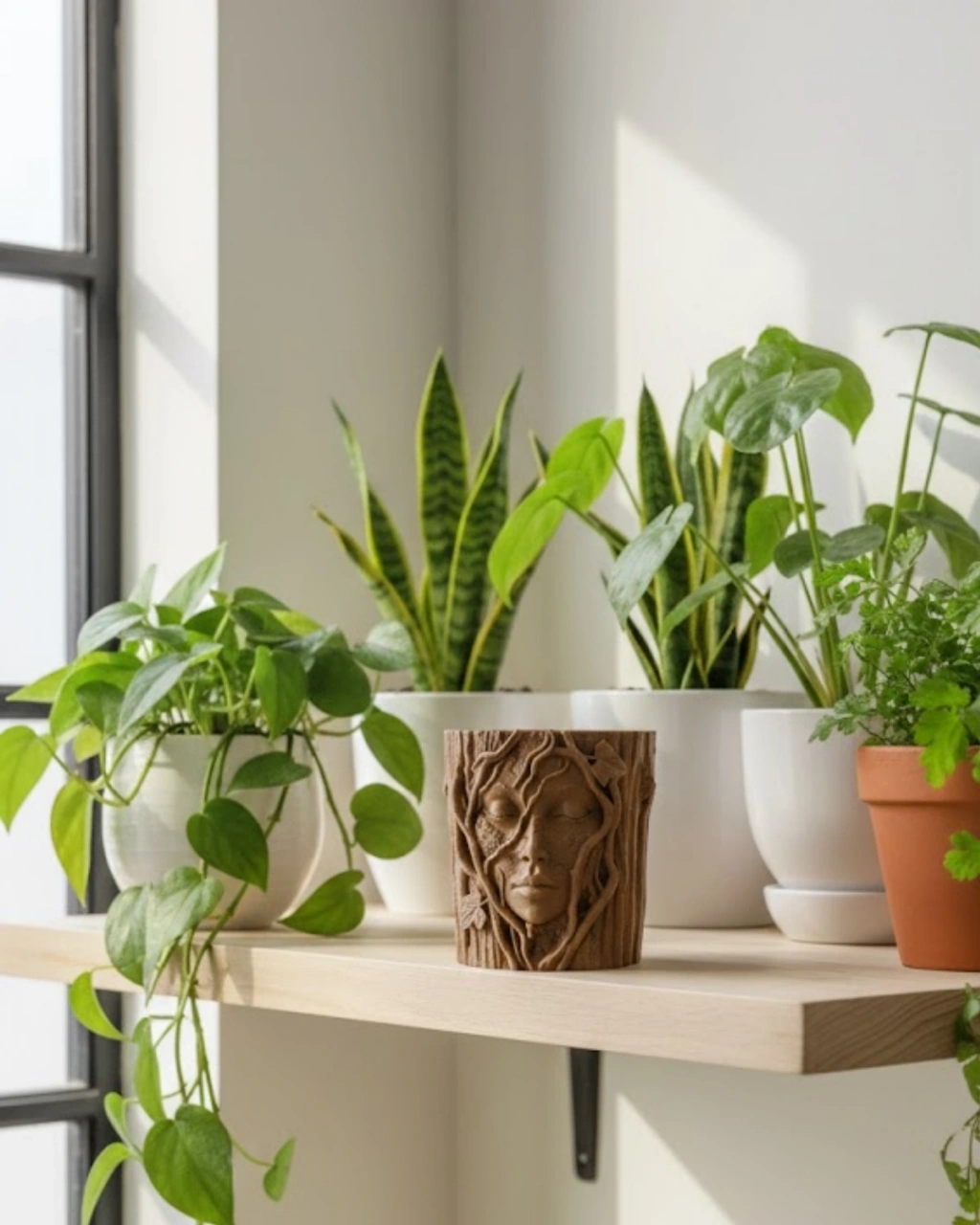 Doğanın zarafetini heykelsi bir formda sunan bu özel tasarım saksı, dekorasyonunuza karakter kazandırmak için tasarlanmıştır. Ağaç dokusu üzerine işlenmiş sakin yüz ifadesi, huzur ve dinginliği simgeler. Sarmaşıkların yüzü sarmalayan detaylı yapısı ürüne masalsı bir hava katmaktadır.Toprak tonlarının sıcaklığı mekâna doğal bir ambiyans sunarken, üç boyutlu kabartmalar premium bir görünüm sağlar. Minimal alanlarda bile güçlü bir dekoratif etki yaratır. Hem ev hem ofis ortamında dikkat çekici bir aksesuar olarak öne çıkar.