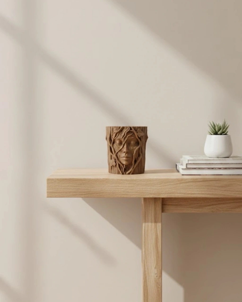 • 3D Doğal Ahşap Görünümlü Yüz Detaylı Dekoratif Vazo Sanat Tasarım