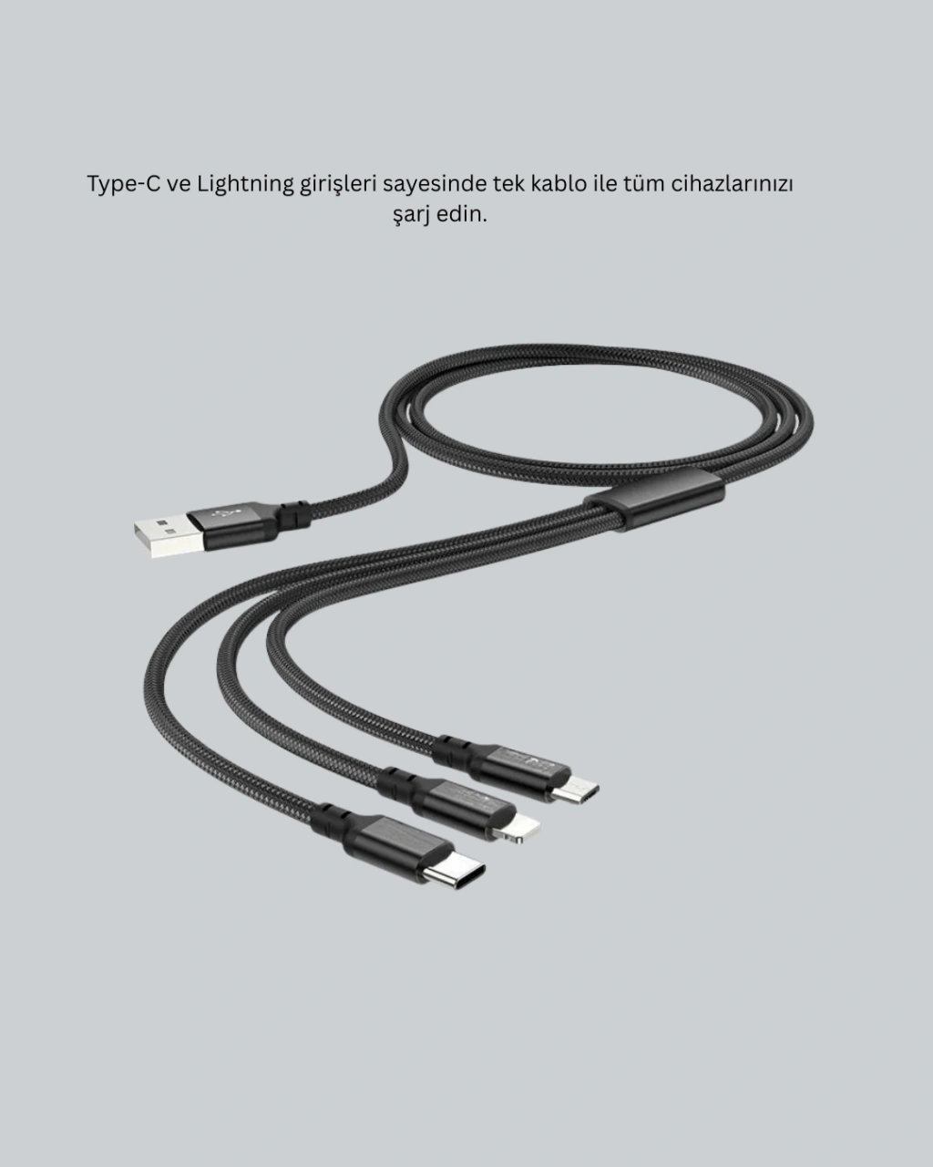 Bu 3’ü 1 arada hızlı şarj kablosu, iOS, Android ve Type-C girişli tüm cihazlarla uyumludur. 1,2 metre uzunluğu ile günlük kullanımda ideal mesafe sunar. Aynı anda birden fazla cihazı şarj edebilme özelliği sayesinde priz kalabalığını ortadan kaldırır. Metal alaşımlı dış kaplama ve TPE malzemesi ile sağlam ve dayanıklıdır. Paslanma, oksitlenme ve kırılmalara karşı korunaklı yapısı uzun ömürlü kullanım sağlar. Dahili akıllı çip teknolojisi, cihaz pilini korur ve güvenli şarj sağlar. Saf bakır tel çekirdeği, düşük direnç ile hızlı şarjı mümkün kılar. Evde, işte veya seyahatte tüm cihazlarınızı tek kablo ile şarj edebilme kolaylığını sunar.
