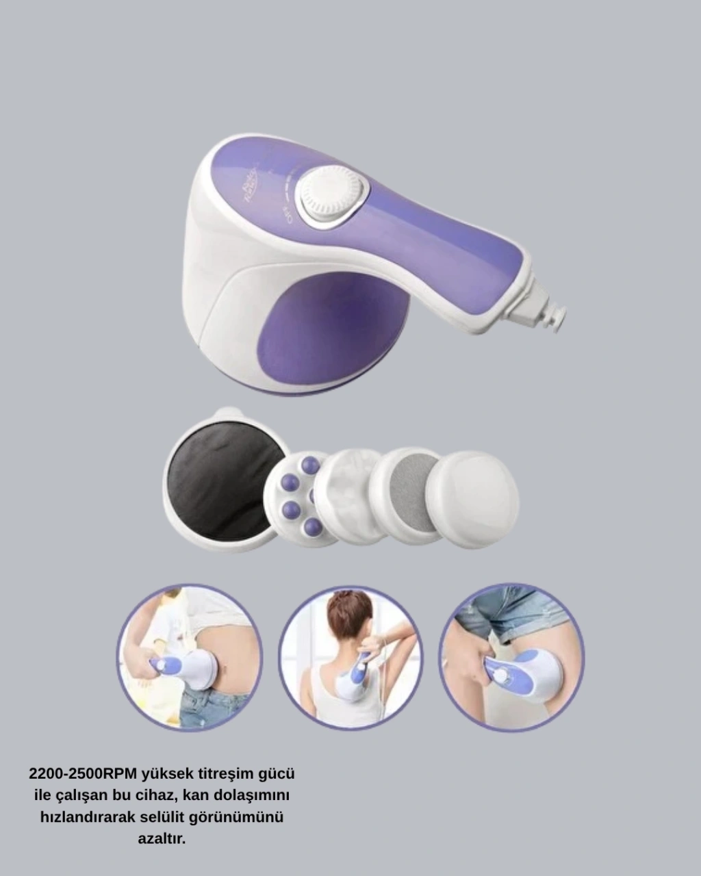 Profesyonel bakım merkezlerine gitmeden vücudunuzu şekillendirmek ister misiniz? Bu elektrikli masaj aleti, 5 farklı başlığı ve yüksek titreşim teknolojisiyle tam da bu amaç için tasarlandı. 2200-2500 RPM gücündeki motoru sayesinde kasları uyarır, kan dolaşımını artırır ve yağ yakımını destekler.Cilt yüzeyindeki ölü hücrelerin giderilmesine yardımcı olurken, düzenli kullanımda daha pürüzsüz ve sıkı bir görünüm kazandırır. Özellikle selülit problemleri yaşayan kişiler için etkili bir çözümdür.Kompakt tasarımı sayesinde evde, seyahatte veya ofiste rahatlıkla kullanılabilir. Kullanıcı dostu ergonomik yapısı, elinizin kaymasını önler ve konforlu bir tutuş sağlar.Spor öncesi kasları ısıtmak, sonrasında ise gevşetmek için idealdir. Hem es hem sağlık açısından destek sunan bu cihaz, cilt tonunuzu dengeleyerek yenilenmiş bir görünüm elde etmenizi sağlar.Güçlü, sessiz, etkili ve güvenli — vücut bakımında profesyonel bir dokunuş arayanlar için mükemmel bir seçim.