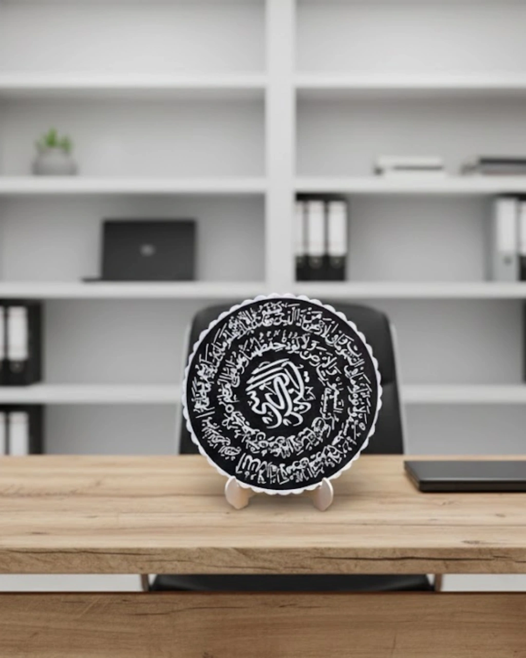 Ayetel Kürsi yazılı bu özel tasarım dekoratif pano, hem es hem de manevi değeri bir arada sunan şık bir ev aksesuarıdır. Siyah zemin üzerine beyaz hat yazısı ile tasarlanan bu ürün, bulunduğu ortama zarif bir duruş ve anlamlı bir atmosfer kazandırır. Yuvarlak formu sayesinde klasik tabloların dışına çıkarak modern bir görünüm sunar.Merkezde yer alan güçlü hat tasarımı ve çevresini saran detaylı yazı kompozisyonu, görsel bütünlüğü üst seviyeye taşır. Yazıların belirginliği ve kontrast yapısı sayesinde uzaktan bile dikkat çeker. Bu özelliği sayesinde hem salon dekorasyonunda hem de çalışma odalarında es bir odak noktası oluşturur.Masaüstü standı sayesinde konsol, kitaplık, sehpa ve ofis masasında rahatlıkla kullanılabilir. Duvara monte gerektirmeyen yapısı ile pratik kullanım sunar. Minimal dekorasyon sevenler için sade ama etkileyici bir tamamlayıcıdır.Ramazan ayında, kandillerde ya da özel günlerde anlamlı bir hediye alternatifi olarak da tercih edilebilir. Manevi değeri yüksek bir ürünü şık bir dekor formunda sunar.