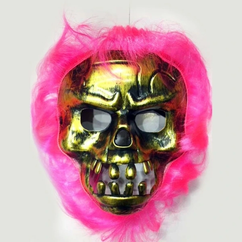 Cadılar Bayramı Maskesi PembeÜRÜN DETAYLARICadılar Bayramı Kurukafa MaskesiMaskenin etrafı pembe saçlarla çevrilmiştirKaliteli plastik malzemeden üretilmiştirStandart Yetişkin ve Çocuk Uyumlu Lastik atı sayesinde yüze tam oturur