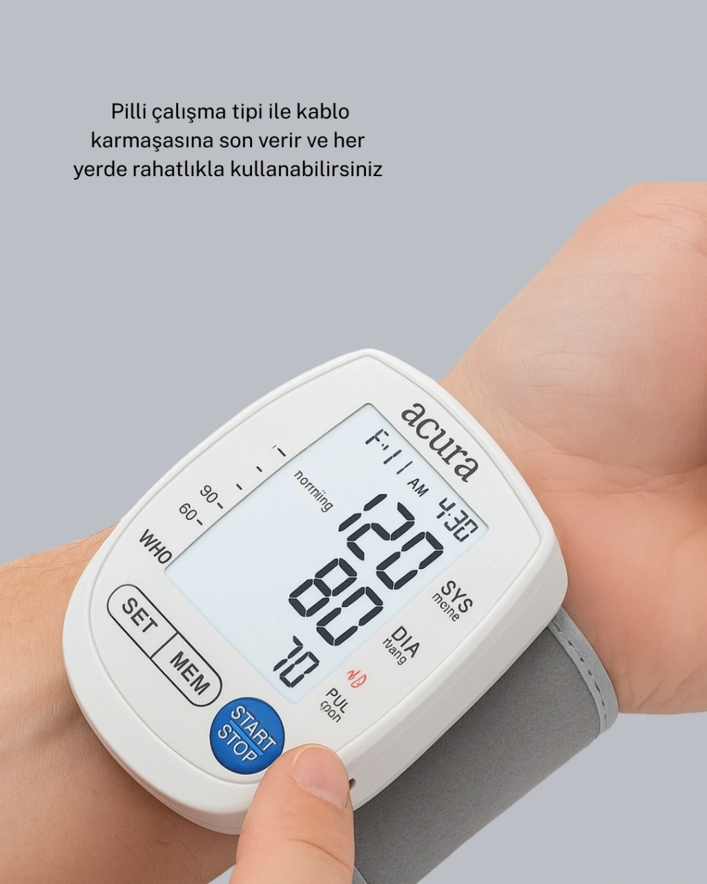 Bu dijital bilek tansiyon aleti, hem şarjlı hem pilli çalışma özelliği ile her koşulda en pratik tansiyon ölçümünü sunar. Özellikle yoğun tempoda yaşayanlar için hızlı ölçüm özelliği büyük kolaylık sağlar. Bileğe takıp tek tuşa basmanız yeterlidir; cihaz birkaç saniye içinde tansiyon ve nabız değerlerinizi net bir şekilde ekranda gösterir. Büyük dijital ekran, ölçüm sonuçlarını daha okunabilir hâle getirir. Cihazın hafıza özelliği, geçmiş ölçümlerinizi kaydederek tansiyon seyrini takip etmenize olanak tanır. Bu özellik, özellikle düzenli tansiyon kontrolü yapan kullanıcılar için oldukça değerlidir. Pilli kullanım özgürlük sunarken, şarjlı mod uzun süreli kullanımlarda pratiklik sağlar. Kompakt tasarımı sayesinde çantanızda rahatlıkla taşıyabilir, seyahatlerde yanınızdan ayırmadan kullanabilirsiniz. Kablo gerektirmemesi, kullanım alanınızı tamamen özgürleştirir. Hem pratik hem güvenilir bir tansiyon takip cihazı arayanlar için idealdir.