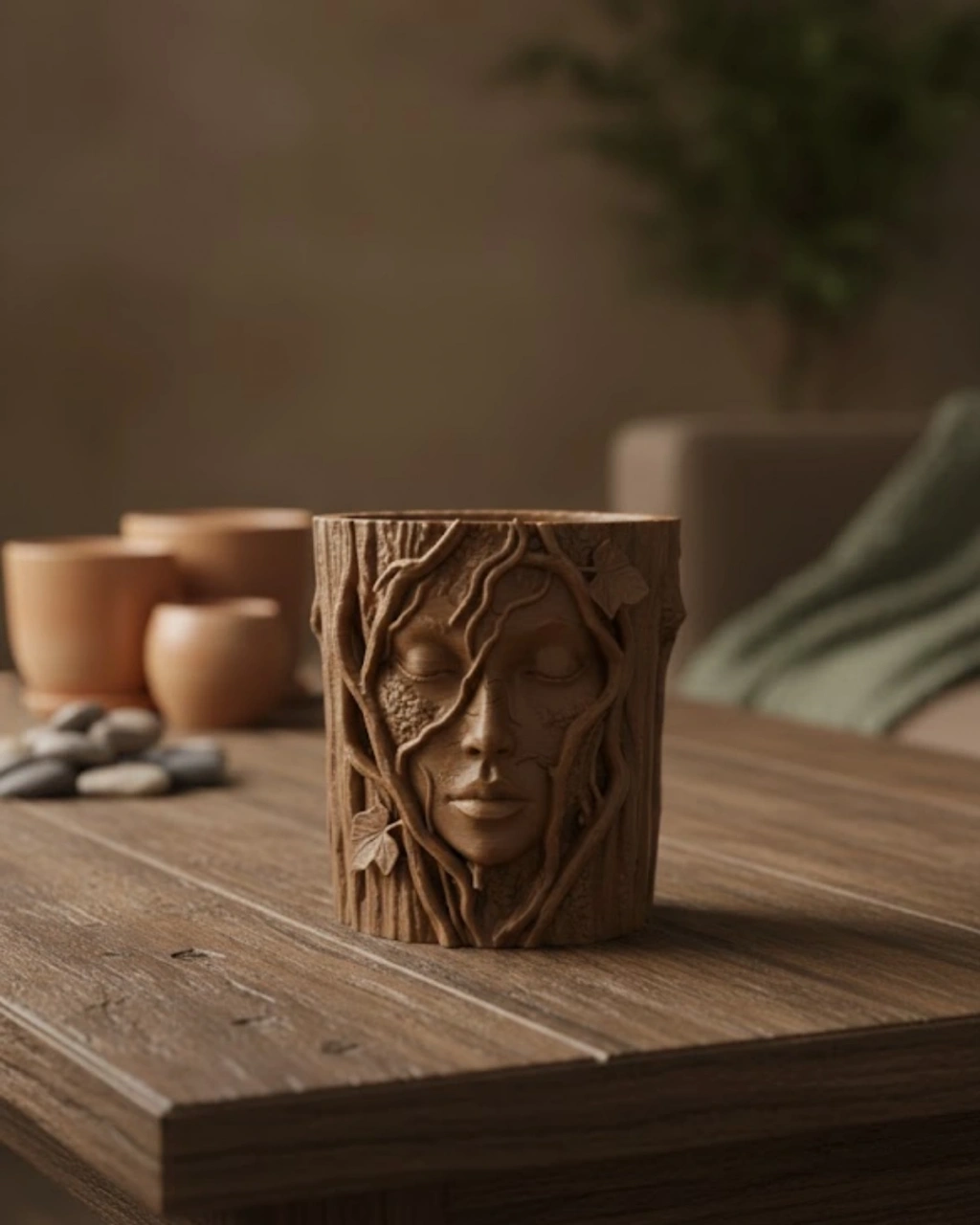 • Doğa Temalı Yüz Detaylı Dekoratif Vazo 3D Ağaç Desenli Şık Saksı