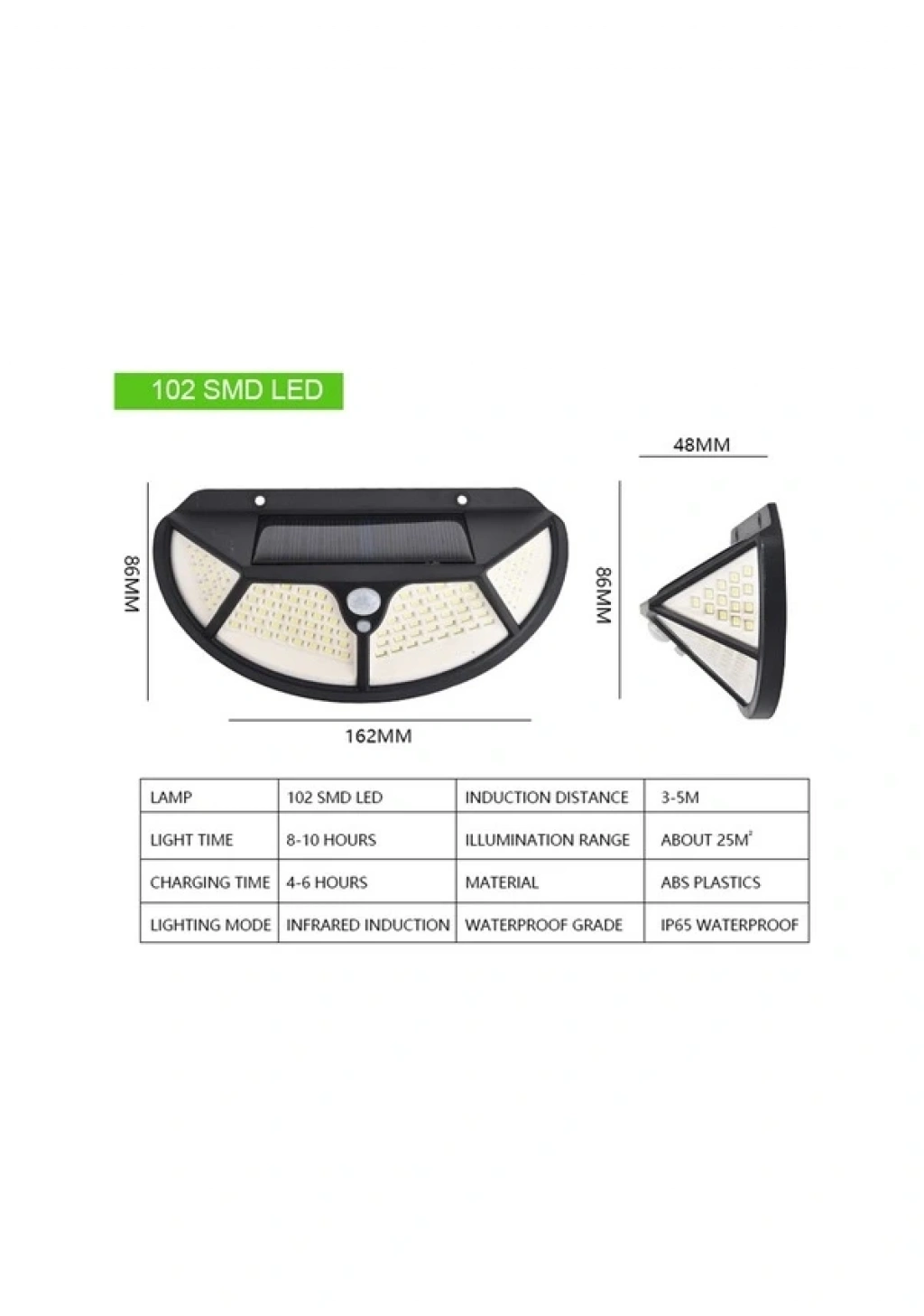 Fonksiyonel Sensörlü 102 Ledli Solar Bahçe LambasıBahçe balkon teras gibi dış mekanlarınız aydınlık ve dekoratif olması için güneş enerjili solar bahçe aydınlatma – solar lamba.Solar güneş enerjili bahçe aydınlatmanız sabahleyin güneş enerjisi ile kendini şarj eder , gece olunca sensörü sayesinde otomatik yanar.Balkonda , bahçede , pencerede , terasta kabloya gereksinim duymadan kolayca kullanabilirsiniz.Ürün Özellikleri;Malzeme: ABS plastikTipler: 102 LED (tip1)Hücre: Dahili 1*3.7V 1200mAh şarj edilebilir pilVoltaj: 220VGüçler: 10WIşık efekti: Hassas Işık Kontrolü+ PIR hareket sensörüIşık rengi: BeyazŞarj saatleri: 4-6 saatÇalışma saatleri: 8-10 saatSu direnci: IP65Algılama açısı: 120°Algılama mesafesi: 1-3  metreAydınlatma aralığı: 15㎡(tip1)Paket boyutu: 170*90*60mm/6.69*3.54*2.36inPaket ağırlığı: 169g/5.96ozPaket İçeriği;1 adet Solar Güneş Enerjili 102 Cob Ledli 3 Modlu Hareket Sensörlü Oval Bahçe Lambası