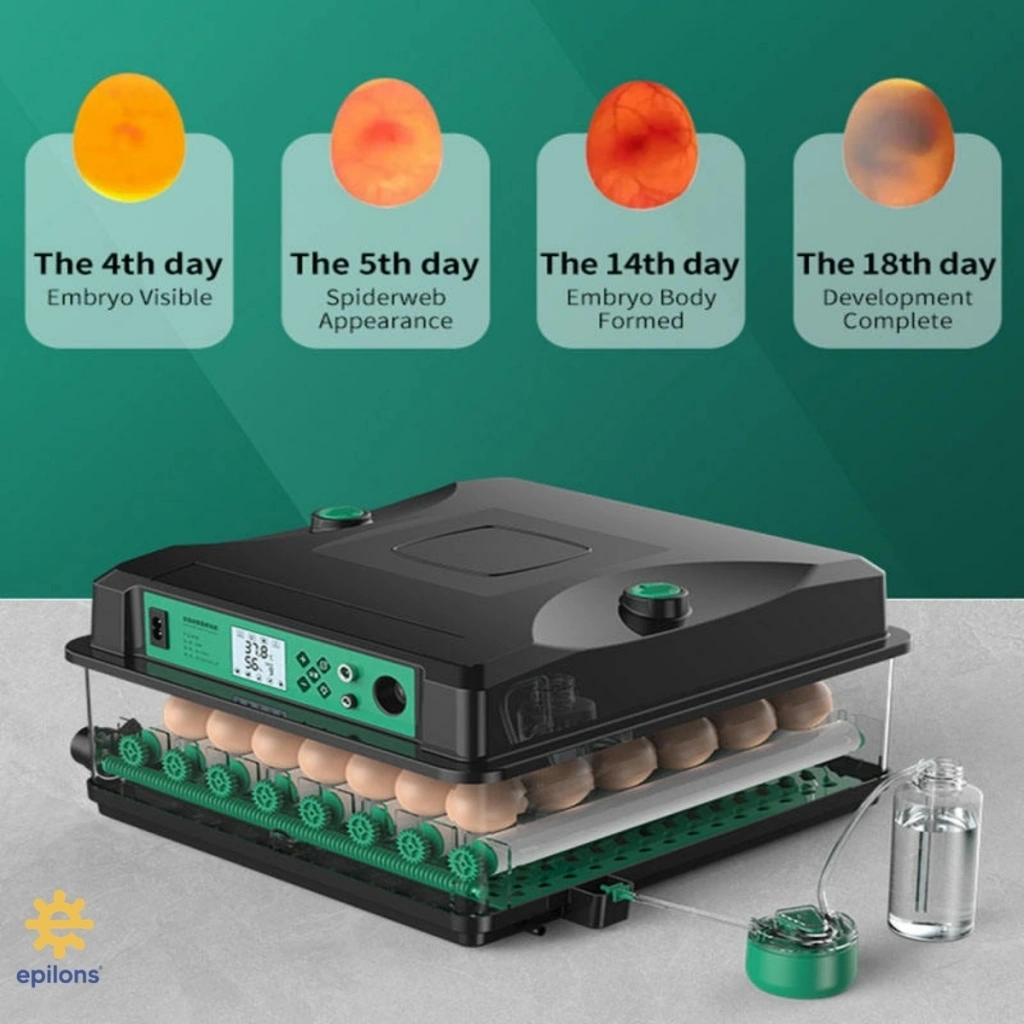 • Epilons FX64 Model Tam Otomatik Kuluçka Makinesi, yeni nesil havalandırmalı sulu sistemi ile ideal çözüm sunar.