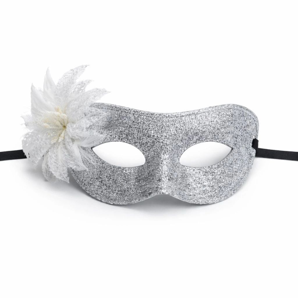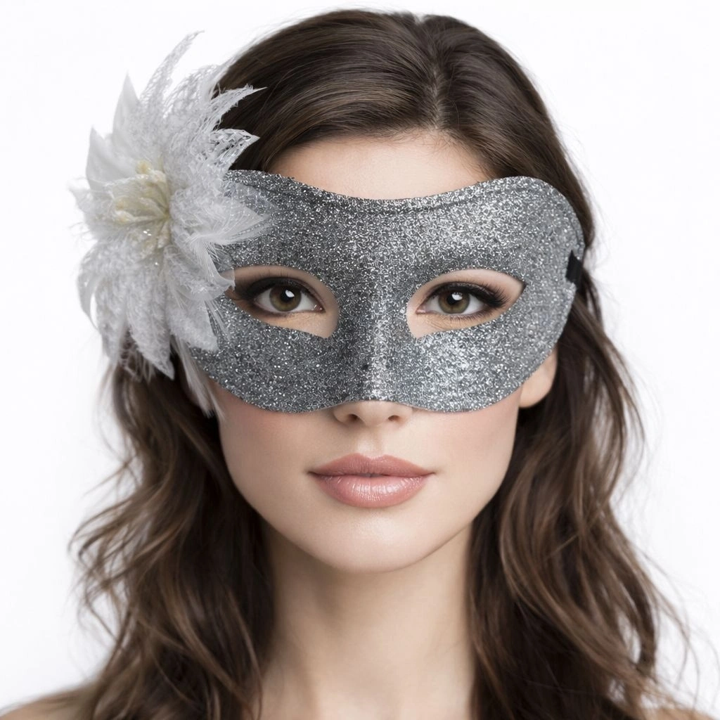 Maskeli partilerde fark yaratmak isteyenler için tasarlanan gümüş simli tüylü kadın balo maskesi, zarif Venedik stilini modern glitter dokunuşuyla birleştirir.