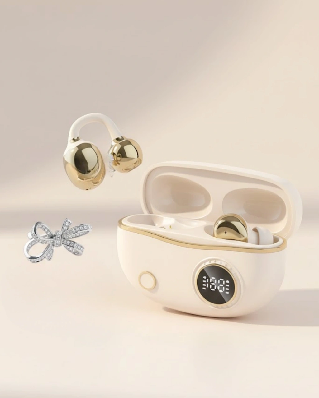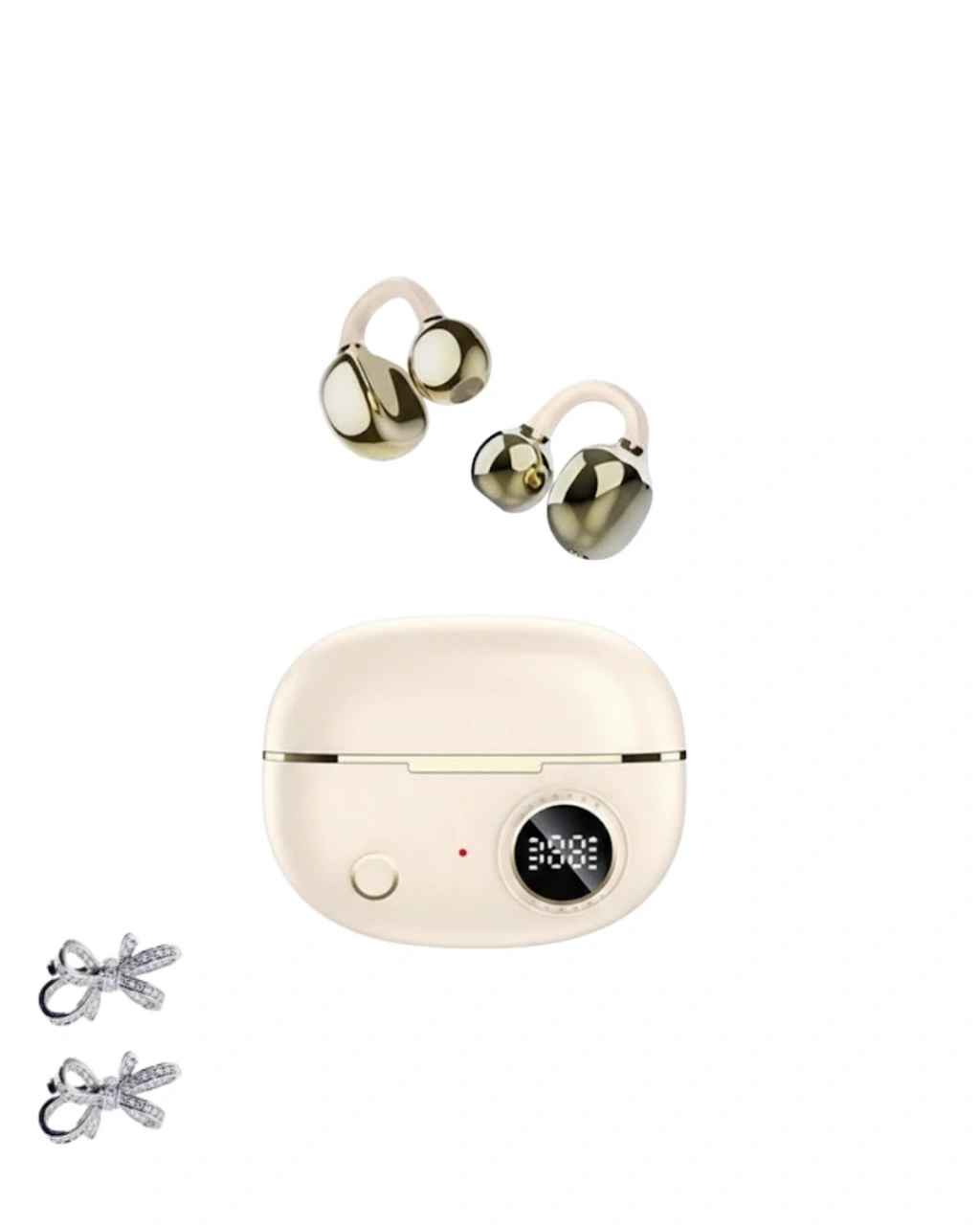 Bu kulak klipsli Bluetooth kulaklık, fonksiyonellik ve estetiği bir araya getirir. Eller serbest kullanım sunan yapısı, günlük hayatı kolaylaştırır. Kompakt tasarımı sayesinde her ortamda rahatça taşınabilir.Uzun pil ömrü, net ses performansı ve zarif tasarımıyla öne çıkar. 2 kurdele küpe hediyeli set içeriği sayesinde şık ve kullanışlı bir hediye seçeneği sunar.