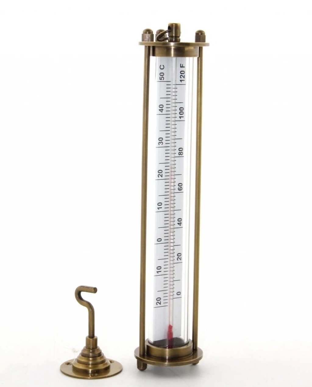 PİRİNÇ TERMOMETRE MODEL 1Ürün ÖzellikleriPirinç termometre, klasik ve şık tasarımıyla hem dekoratif hem de işlevsel bir sıcaklık ölçüm aracıdır. 16x6 cm boyutunda ve dayanıklı pirinç malzemeden üretilmiş olup, sıcaklık ölçümünü hassas bir şekilde yapar. Hem Celsius hem de Fahrenheit dereceleri gösteren yapısıyla geniş bir kullanım alanına sahiptir. Antik pirinç kaplama detaylarıyla vintage bir görünüm sunar ve duvara ya da bir stand üzerine monte edilebilir. Ev, ofis veya denizcilik temalı dekorasyonlarda nostaljik bir dokunuş sağlar.Paket İçeriği1 Adet Pirinç Termometre