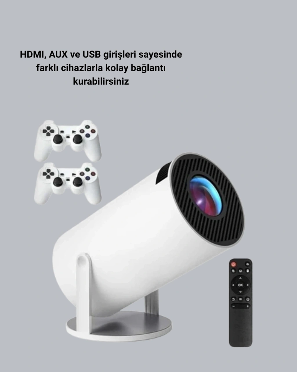 Bluetooth 5.0 ve Wi-Fi 6 destekli bu 4K projeksiyon cihazı, kablosuz bağlantı kolaylığı ve üstün görüntü kalitesiyle dikkat çeker. Wi-Fi 6 teknolojisi, yüksek hızda veri aktarımıyla videoların donmadan akmasını sağlar; Bluetooth 5.0 bağlantısı ise kablosuz hoparlör veya kulaklıklarla güçlü bir ses deneyimi sunar.4K çözünürlük desteği, sinema kalitesinde netlik sunarken çift kollu ayarlanabilir tasarım, görüntüyü dilediğiniz açıda konumlandırmanıza olanak tanır. HDMI, USB ve AUX girişleri sayesinde bilgisayar, telefon, tablet veya oyun konsolu gibi farklı cihazlarla kolayca bağlantı kurabilirsiniz.Oyunseverler için geliştirilen bu model, 10.000’den fazla oyun desteğiyle sınırsız eğlence imkânı sunar. Ayrıca, 4.000’den fazla uygulama desteğiyle film, müzik, eğitim ve sosyal medya platformlarına kolay erişim sağlar.Ekran yansıtma özelliği, mobil cihazınızdaki içeriği kablosuz olarak büyük ekrana taşımanıza olanak tanır. Hafif ve taşınabilir yapısı, evde, ofiste veya dış mekanlarda pratik kullanım imkânı sağlar.Modern tasarımı, güçlü bağlantı teknolojileri ve üstün görüntü kalitesiyle bu projeksiyon cihazı, multimedya deneyiminizi bir üst seviyeye taşır. Sinema, oyun ve sunum keyfini tek cihazda yaşayın!