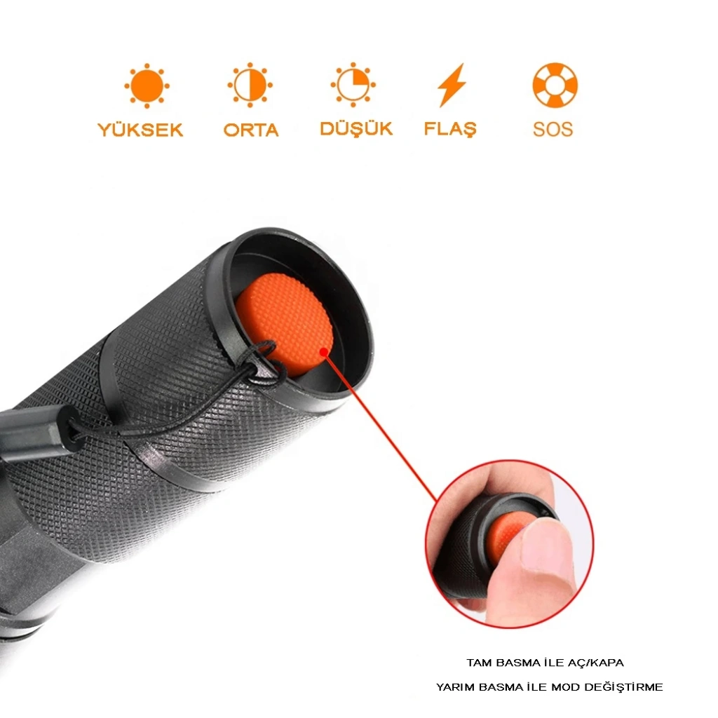 Kullanım Şekli           :4 modda Aydınlatma Orta Yüksek Ve Sellektör SOS