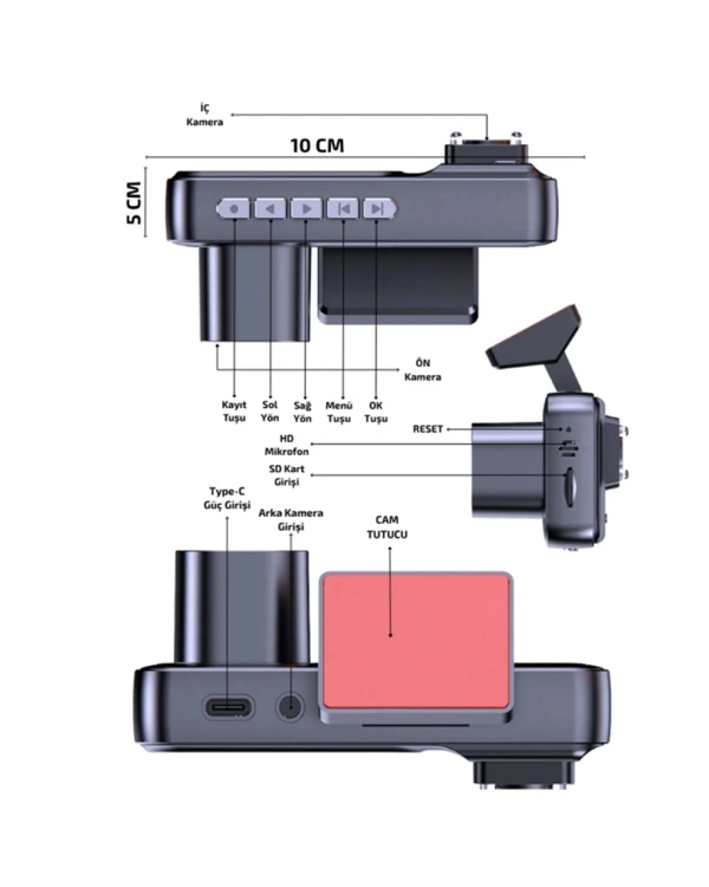 Bu sistem, hem kullanıcıların hem de yolcuların güvenliği için tasarlanmıştır. Ön kamera 1080p çözünürlüğüyle tüm detayları yakalarken; iç kamera çocuklar, yolcular veya kabin içi hareketleri kontrol altında tutar. Arka kamera, geri vites kullanımında otomatik olarak devreye girer ve ekranda park çizgileri gösterir. Ayrıca park halindeyken hareket algılandığında dahili Wi‑Fi bağlantısı üzerinden anlık bildirim alınabilir. G‑sensör kazalar sırasında kayıtları koruma altına alarak olası sigorta veya adli süreçler için güvenilir veri sağlar. Döngüsel kayıt ile ayni kaliteyle uzun süreli kayıt yapılabilir. 32 GB microSD kart dahil paketle birlikte, 128 GB’e kadar yükseltme seçeneği sunulur. Uygulama destekli kontrol, her noktanın net görüntülenmesini sağlar.