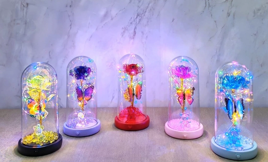 IŞIKLI MÜZİKLİ ROMANTİK KELEBEKLİ FANUS İÇİNDE GÜLÜrün ÖzellikleriIşıklı müzikli romantik kelebekli fanus içinde gül, zarif detayları ve etkileyici ışık gösterisiyle dekorasyona romantik bir atmosfer kazandıran özel bir hediyelik üründür. Şeffaf fanus tasarımı içerisinde yer alan yapay gül ve kelebek figürü, LED ışık sistemi sayesinde çalıştırıldığında yumuşak ve göz alıcı bir aydınlatma sunar. Müzikli yapısı ile görsel etkiyi hoş bir melodiyle tamamlayan bu model, bulunduğu ortamda dikkat çekici ve duygusal bir ambiyans oluşturur. 21x11 cm ölçüsü sayesinde masa, komodin, raf ve vitrin üzerinde rahatlıkla sergilenebilir ve dekoratif duruşuyla öne çıkar. Renk seçimi bulunmayan ürün, görsellerde yer alan renklerden biri olacak şekilde olarak gönderilmektedir. Sevgililer günü, doğum günü, yıl dönümü ve özel günler için anlamlı bir hediye alternatifi sunan bu fanus, romantik ve şık tasarımıyla her yaş grubuna hitap eder.Paket İçeriği1 adet Işıklı Müzikli Romantik Kelebekli Fanus İçinde Gül