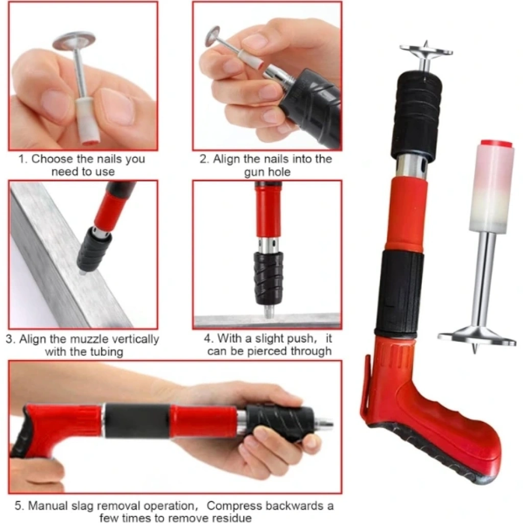 MANUEL ÇİVİ TABANCASIÜrün ÖzellikleriManuel Çivi Tabancası, genellikle ahşap, çelik veya beton yüzeylere çivi, dübel veya perçin yerleştirmek için kullanılan pratik bir el aletidir. Ürünün üst kısmında yer alan siyah ayar halkası sayesinde 3 farklı kuvvet seviyesi (vites) seçilebilir. Bu, yüzeyin sertliğine göre sabitleme işlemini optimize eder:1. Vites: Daha yumuşak yüzeyler ve küçük çiviler için uygundur.2. Vites: Orta sertlikte yüzeylerde kullanılabilir.3. Vites: Sert yüzeyler (beton/metal) için yüksek darbe kuvveti sağlar. Kavrama alanı kaymaz ve ele tam oturur, uzun süreli kullanımda bile rahatlık sunar. Ürün, yaylı sistemle çalışır ve perçinleme esnasında yüksek ses çıkarmadan işlem yapılmasına imkân tanır. Aletin ucu, tam isabetli çalışmak üzere tasarlanmıştır, bu sayede çiviler düzgün şekilde yüzeye yerleştirilir.Paket İçeriği1 Adet Manuel Çivi Tabancası