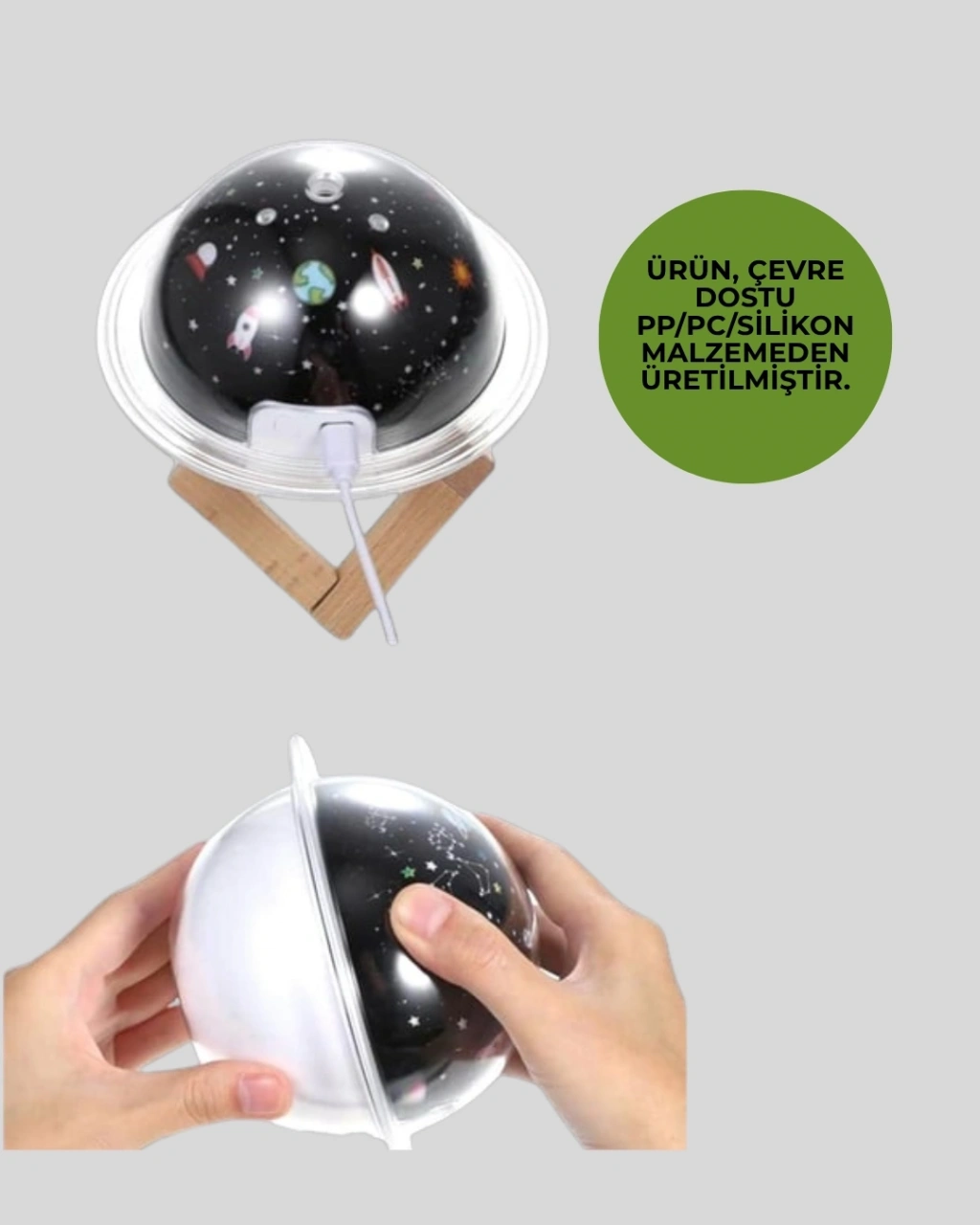 Bu kompakt boyutlu masaüstü nemlendirici, 3 işlevi bir arada sunar: hava nemlendirme, aroma difüzör ve projektör ışıklı gece lambası. 5V düşük voltajla çalışır ve USB kablosu ile kolayca bağlanır. Sessiz çalışma özelliğiyle geceleri rahatsız etmeden çalışabilir.Projektör ışığı, deniz dalgası efektiyle ortama huzur verir. Özellikle çocukların uykuya dalarken rahatlamasını sağlar. Cihazın üst kısmındaki hazneye esansiyel yağ eklenebilir ve bu şekilde aromaterapi deneyimi yaşanabilir. Hem işlevsel hem dekoratif bir üründür. Ofisler, yatak odaları ve küçük alanlar için uygundur.