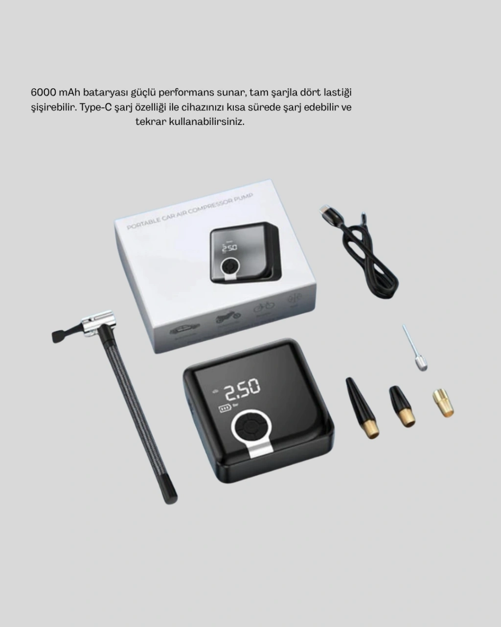 Taşınabilir Akıllı Hava Kompresörü, güçlü motoru ve yüksek performansı ile her aracın ihtiyaç duyduğu kompakt bir çözüm sunar. 150 PSI basınç kapasitesi sayesinde otomobil, motosiklet ve bisiklet lastiklerinin yanı sıra toplar, şişme yataklar ve kamp ekipmanları için de rahatlıkla kullanılabilir. Hem şehir içi kullanımlarda hem de uzun yolculuklarda sürücülere güven veren bu cihaz, acil durumlarda pratik bir çözüm sağlar.Dijital ekranı sayesinde PSI, BAR ve KPA gibi farklı basınç birimlerini kolayca görüntüleyebilir, basınç verilerini milimetrik doğrulukla takip edebilirsiniz. Önceden belirlenen basınç değerine ulaşıldığında otomatik kapanma özelliği devreye girer ve hem lastiğin zarar görmesini engeller hem de enerji tasarrufu sağlar. Bu özelliği sayesinde deneyimsiz kullanıcılar bile rahatça kullanabilir.6000 mAh yüksek kapasiteli bataryası, tek şarjla dört otomobil lastiğini şişirebilecek kadar güçlüdür. Type-C hızlı şarj teknolojisi ile kısa sürede tamamen şarj olabilir. Ek olarak, araç çakmaklığı ile de çalıştırılabilir olması kullanım alanını genişletir. Üzerinde bulunan LED aydınlatma, gece yolculuklarında veya karanlık ortamlarda işlem yapmayı kolaylaştırırken, SOS modu acil durumlarda görünürlüğünüzü artırır.Kompakt ve hafif tasarımı sayesinde araç içerisinde çok az yer kaplar. El çantanıza, motosiklet çantanıza veya kamp çantanıza kolayca yerleştirebilirsiniz. Sağlam dış gövdesi uzun süreli kullanım için dayanıklılık sunarken modern tasarımı ile dikkat çeker. Aktif bir yaşam süren sürücüler, kampçılar ve bisiklet tutkunları için vazgeçilmez bir yardımcıdır.