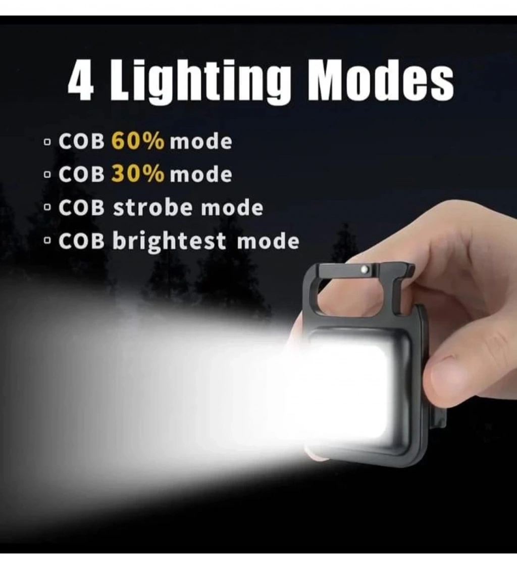 • 4 aydınlatma modu: anahtarlık el feneri 4 aydınlatma modları vardır-COB yüksek modu, COB düşük modu, COB strobe modu ve uzun basın güç düğmesi 2-3 saniye parlak.