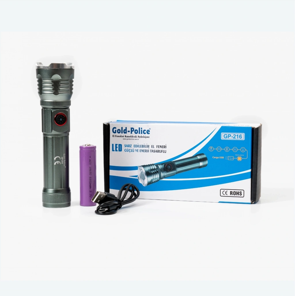 Gold Police GP-216 şarjlı el feneri, kompakt ve hafif tasarımıyla her an yanınızda taşıyabileceğiniz güçlü bir aydınlatma çözümü sunuyor. Güçlü TG LED ile donatılmış bu fener, 2000 lümen ışık gücü ile karanlık ortamlarda en net görüşü sağlarken, enerji tasarruflu çalışma özelliği sayesinde uzun süreli kullanım imkanı tanır.